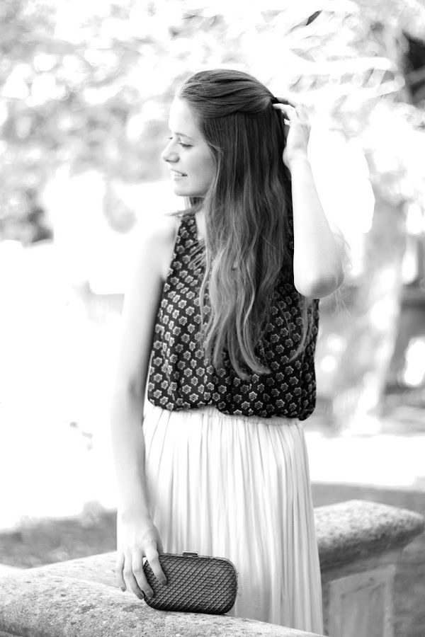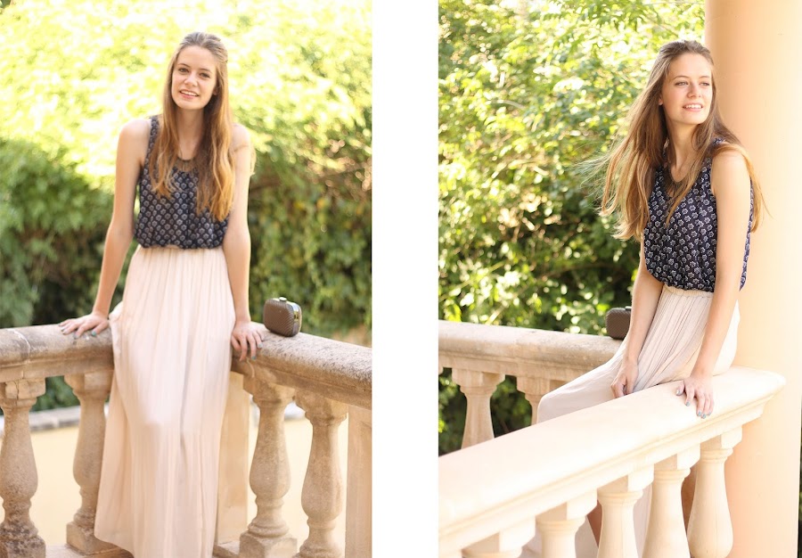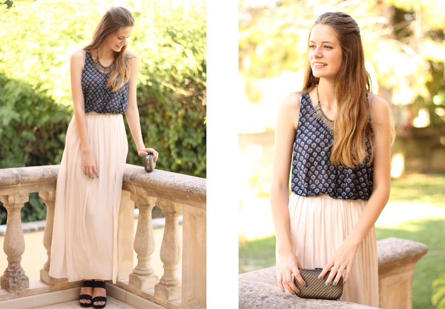 Hoy os enseño un look que nos puede servir para diversas ocasiones, es un look comodín. He combinado una falda larga de color crema con una blusa con estampado de color azul oscuro, ideal para cenas, comidas o ocasiones especiales.