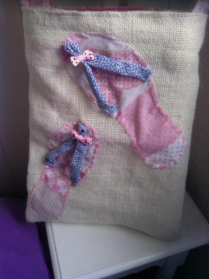 Una preciosa bolsa en tela de saco con unas sandalias rosadas cosidas a mano en colores rosa con azul y el pequeño detalle del lazo le da un toque de ternura al efecto rústico de la bolsa.