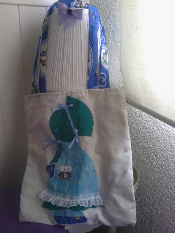 La bolsa del personaje Sara Kay esta hecha toda por partes en 100% algodón, donde se juntan una a una cada pieza que le da forma a esta dulce muñeca con su gorrito verde, vestido en tonos azules con detalles de encaje blanco, pequeños zapatos y un bolsillo en el vestido.