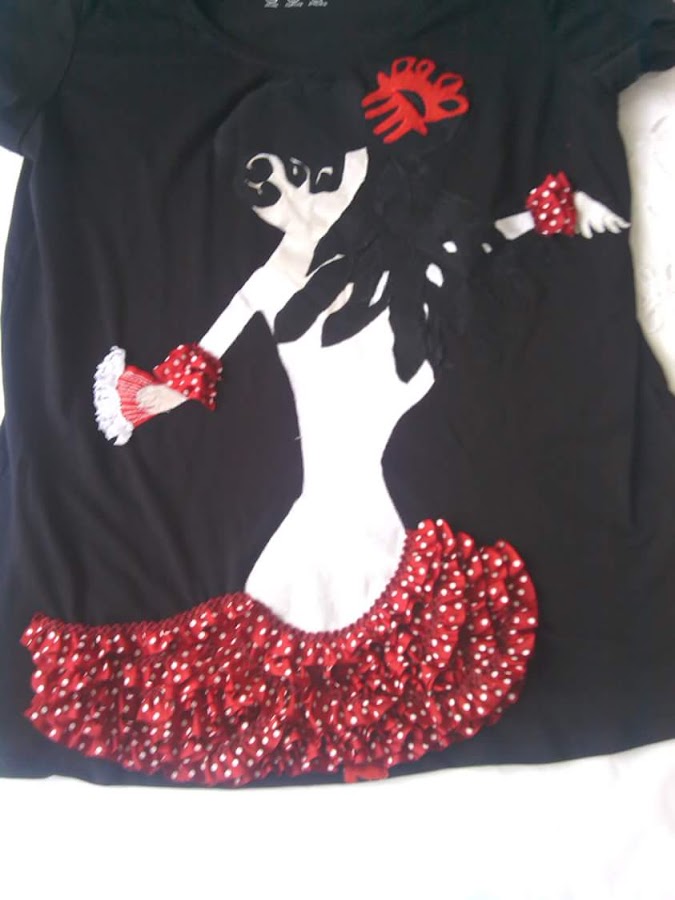 Y para las amantes del flamenco una camiseta con el diseño de una muñeca vestida de flamenco. Este modelo está disponible por 30,00€ por ser uno de los más laboriosos porque lleva muchas horas de minucioso trabajo