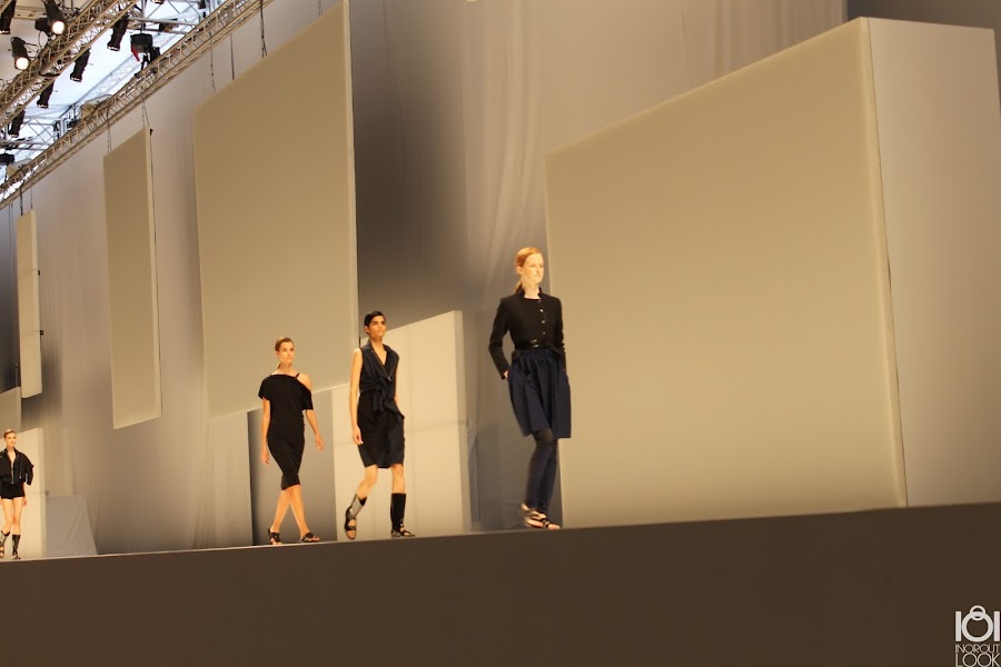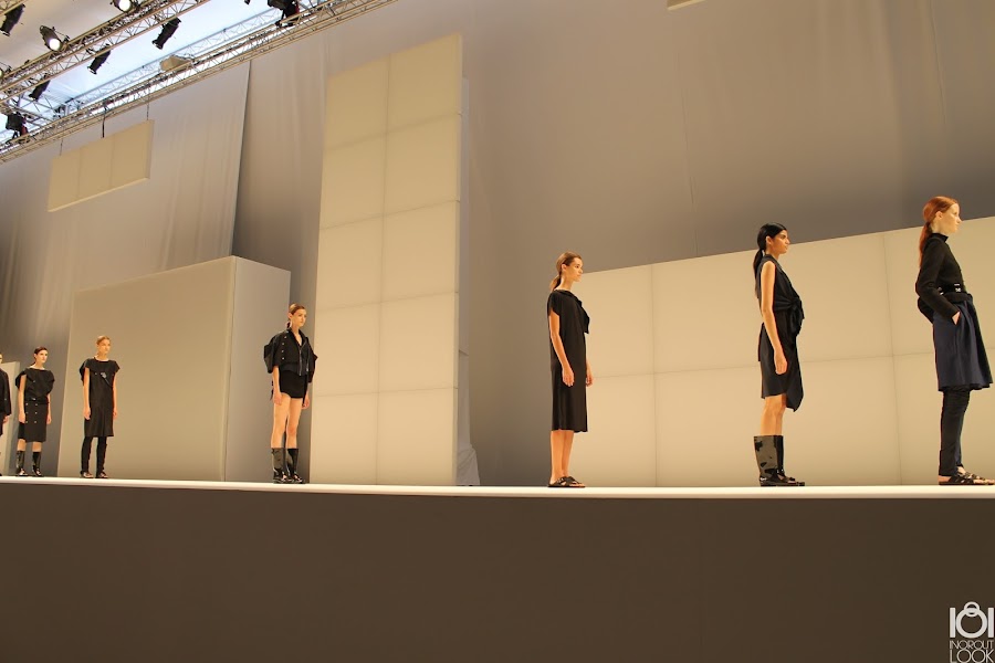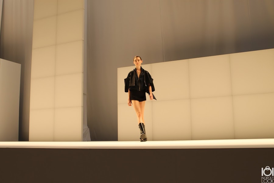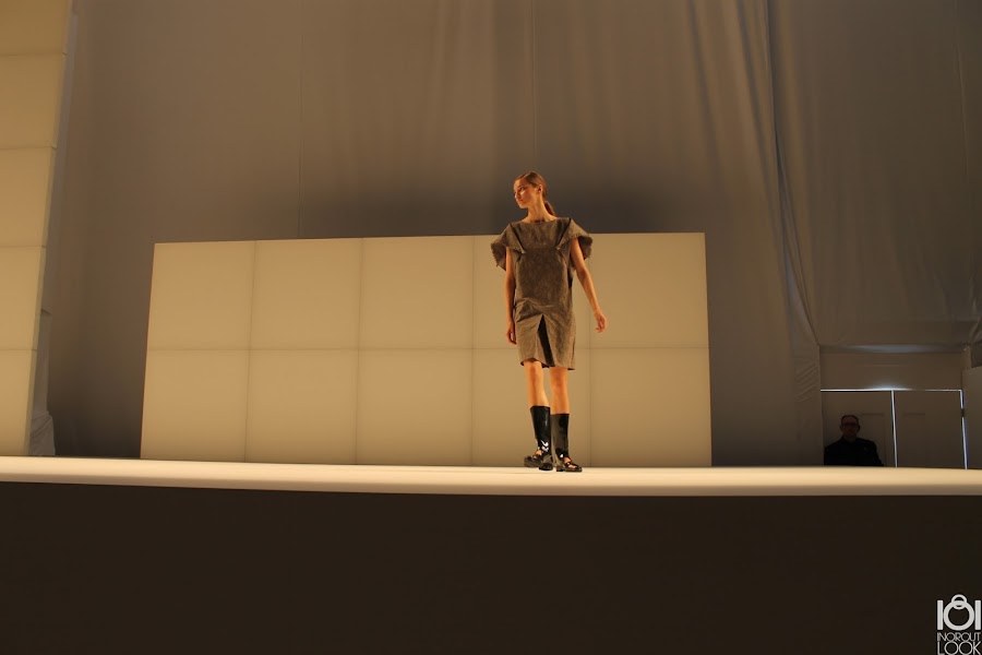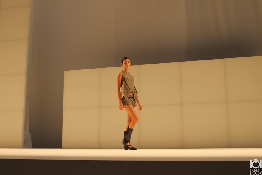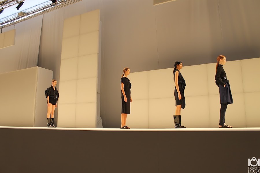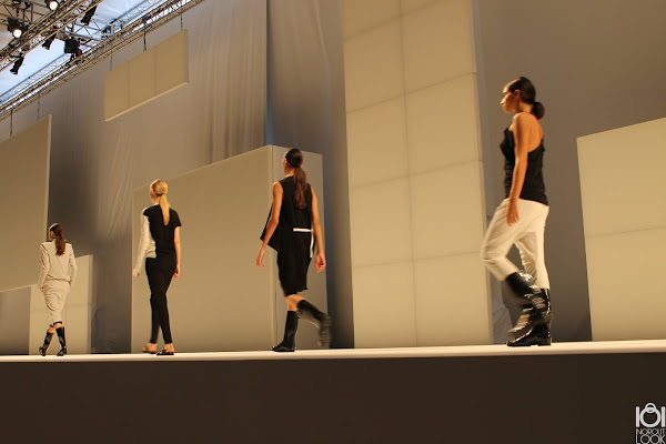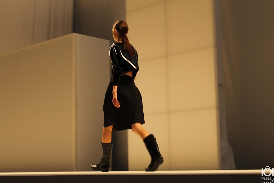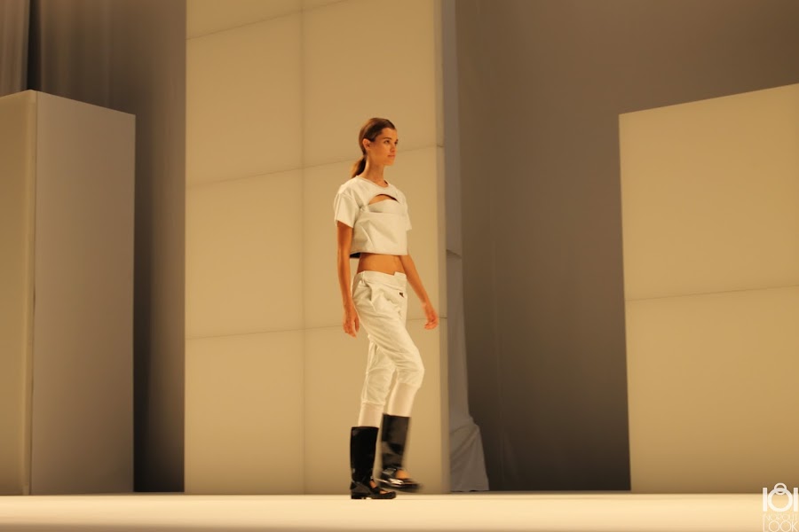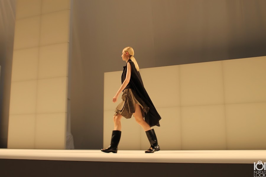 Txell Miras nos trajo un desfile en la 080 Barcelona Fashion Week impecable y sobrio en tonos negros, kaki y blanco con cortes rectos y sin estampados acompañados de botas de agua negras acharoladas.