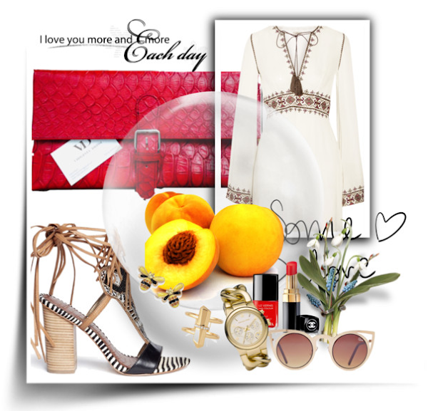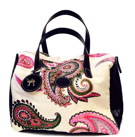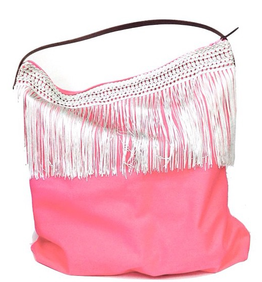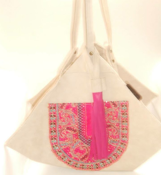 Para ello te propongo el bolso de la colección "Piramide" en piel blanca con el detalle del estampado cachemir y un fleco de color rosa que puedes llevar con tejanos, blusa de color salmón manga larga y sandalias planas en color plateado.