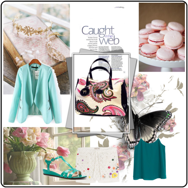 Te dará un estilo juvenil y divertido a la vez de elegante que te propongo llevar con falda tipo short, un top de tirantes turquesa a juego con unas sandalias de poco tacón y un blazer de turquesa más suave para resaltar el estampado cachemir de tu bolso