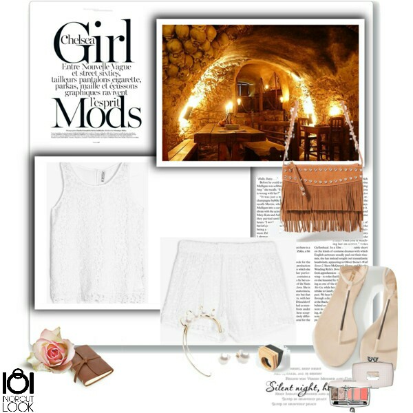 Para una noche descubriendo los rinconcitos de la edad media escondidos en la ciudad, un look impoluto de short 22,95€ y top 15,95€ sin mangas de crochet blanco, con unas sandalias planas de dedo en color nude y detalle metalizado 17,95€ . Bolso bandolera con flecos color camel y pendientes de cuff de perlas blancas con dorado 5,95€
