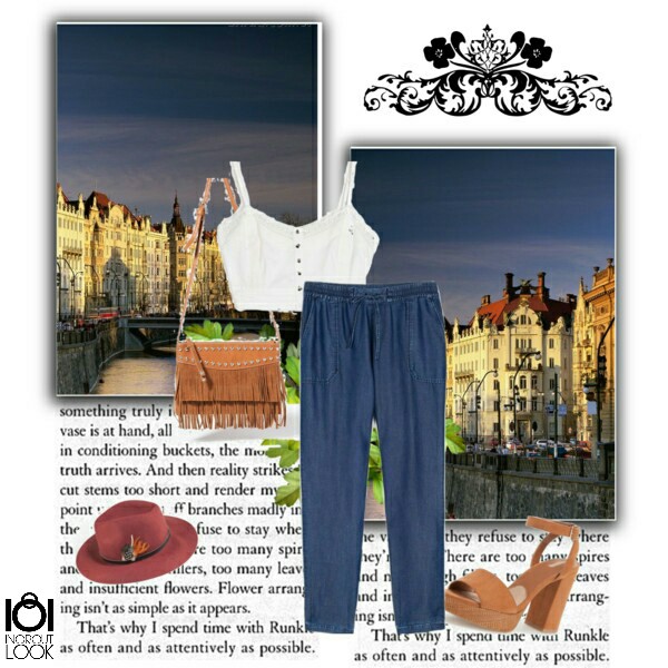 Para disfrutar de un paseo por las callecitas junto al río y sus preciosos edificios, un look con pantalón sarouel denim 22,95€ y un romántico top de tirantes de crochet blanco 12,95€. Sandalias de tacón cuadrado en color camel, un sombrero en color vino tinto con detalle de pluma 17,95€ y bolso bandolera de color camel.