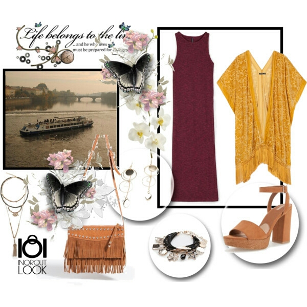 Para una tarde romántica dando un paseo en barco por el Moldava, un look con vestido largo midi de punto en color rojo 15,95€ y por si refresca un poco, un precioso kimono devoré con flecos en color mostaza 29,95€. Sandalias de tacón cuadrado en camel 29,95€ a juego con el bolso bandolera de flecos y tachuelas. Que no falten un collar con colgante 9,95€, pendientes largos 5,95€ y pulseras con abalorios en dorado 4,95€