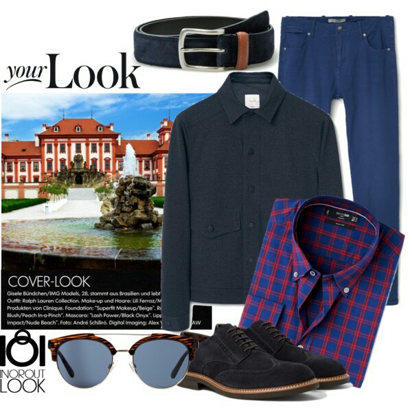 Para ir a ver el Palacio de Trojá o para una noche de ir a cenar a un sitio más formal, he escogido unos tejanos en azul indigo 65,00€ con una camisa de estampados de cuadros azul con rojo 51,00€ y una chaqueta de efecto denim 60,00€. Con unos blucher en azul navy 125,00€ y cinturón a juego 51,00€.