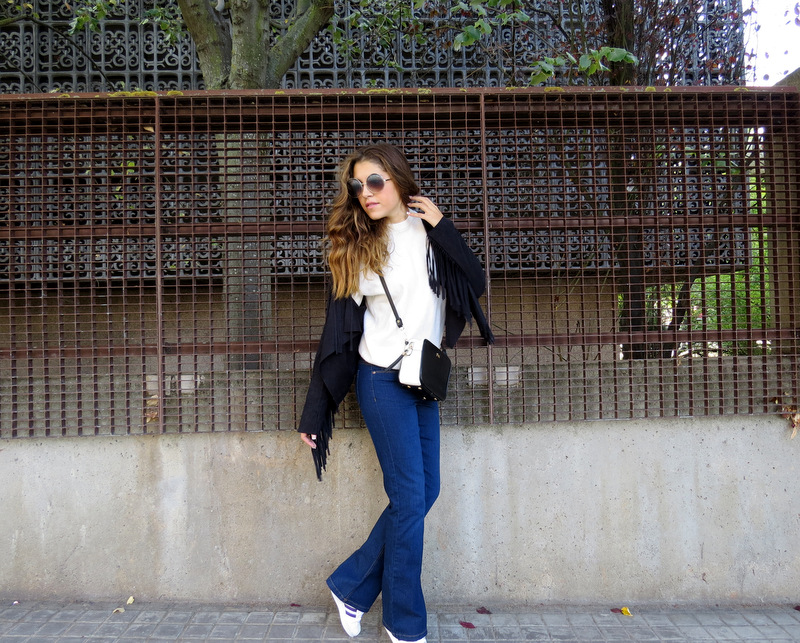 Como me gusta la tendencia de esta temporada, ese estilo años 70. los sombreros, los jeans las minifaldas vaqueras, los flecos (los cuales adoro) y los pantalones campana, una de las prendas de las que en principio me negué a usar (por épocas pasadas donde los llevaba de mil colores chillones y se que muchas de vosotras también) pero esta temporada vienen de forma muy diferente y me encantan!, son geniales combinandolos con blusas y flecos. VIVAN LOS 70!