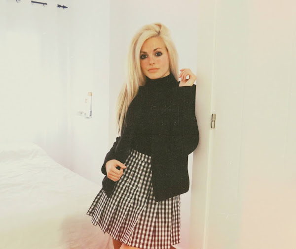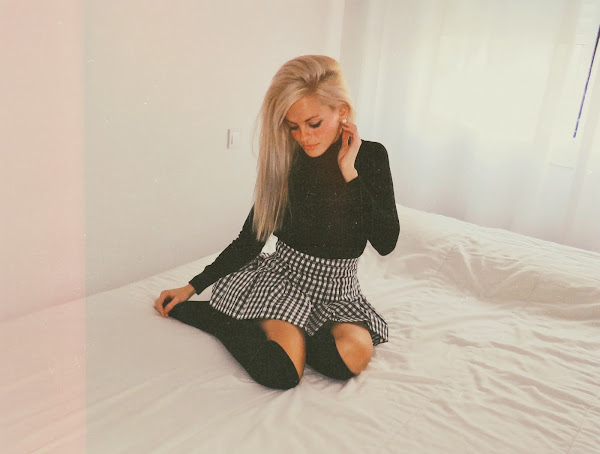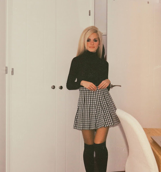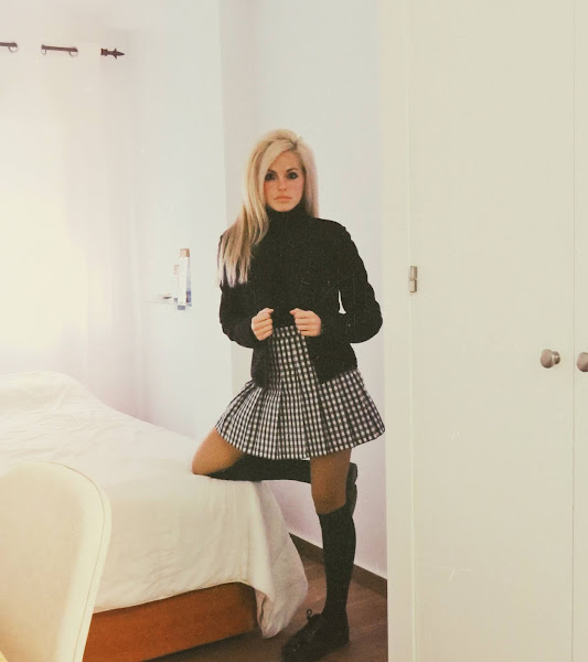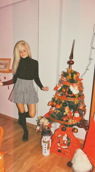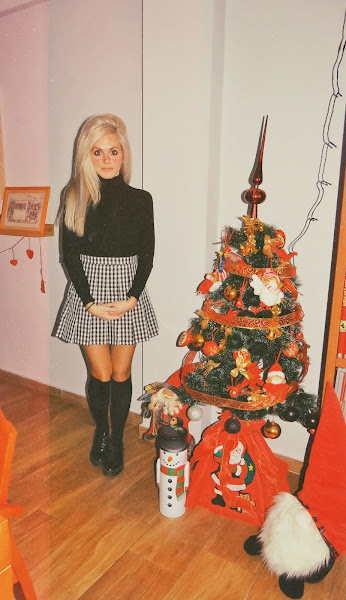 He tratado de recrear este estilo lo máximo posible, combinando la falda con un jersey negro, calcetas negras y peinado con volumen.