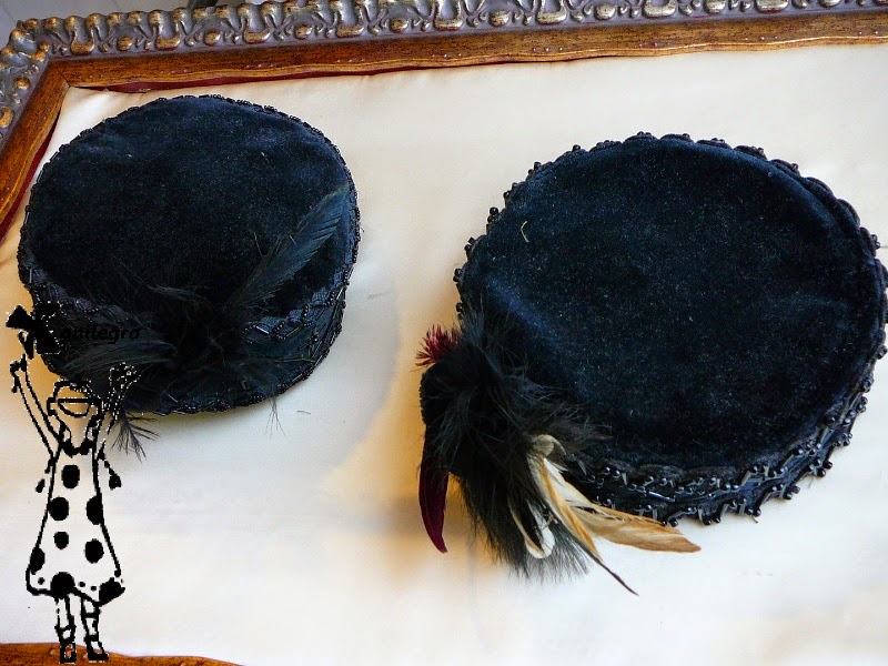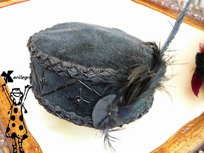 Son como unos pequeños casquetes redondos , forrados de terciopelo y con pasamanería negra bordada en azabache y adornados con plumas , cuando me informe un poco más os cuento