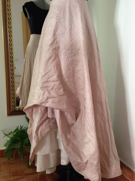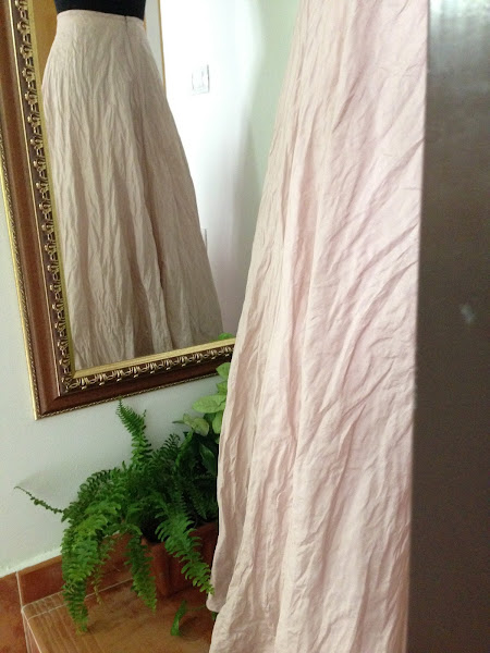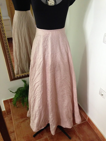 Y una falda cosida por ese verano, destellaba también aquí. Es la falda rosada de la seda con el dobladillo ancho.