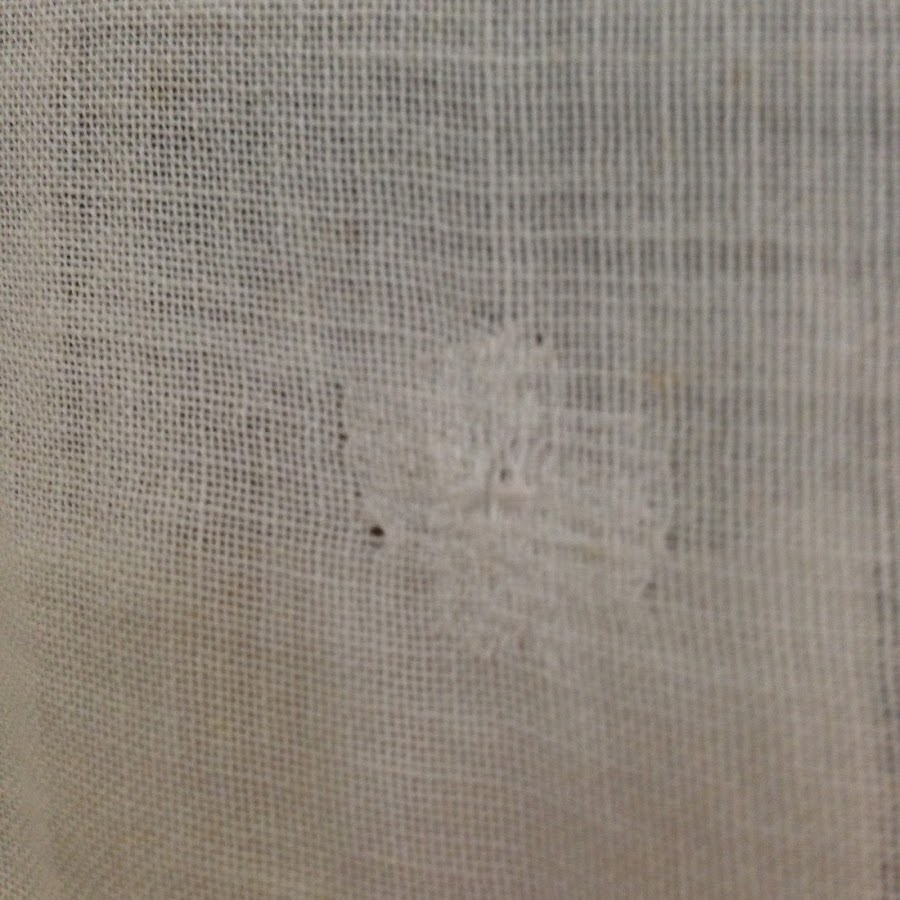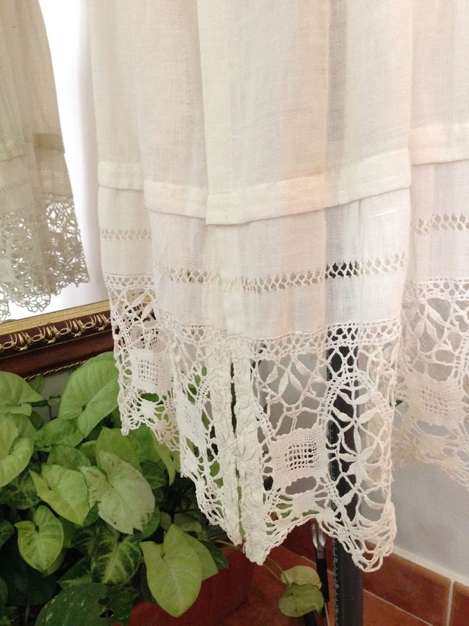 La he cosido de la antigua cortina con el encaje de bolillos, que hacía mi bisabuela. La tela esta muy fina y tiene algunos defectos (los areglaba con mucho cuidado). Por eso la uso solamente con la falda superior. PERO esta super-romántica y adorable!!!