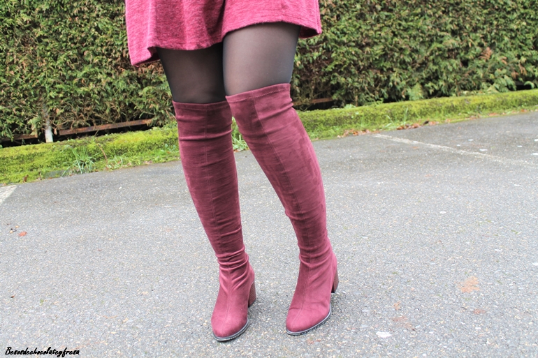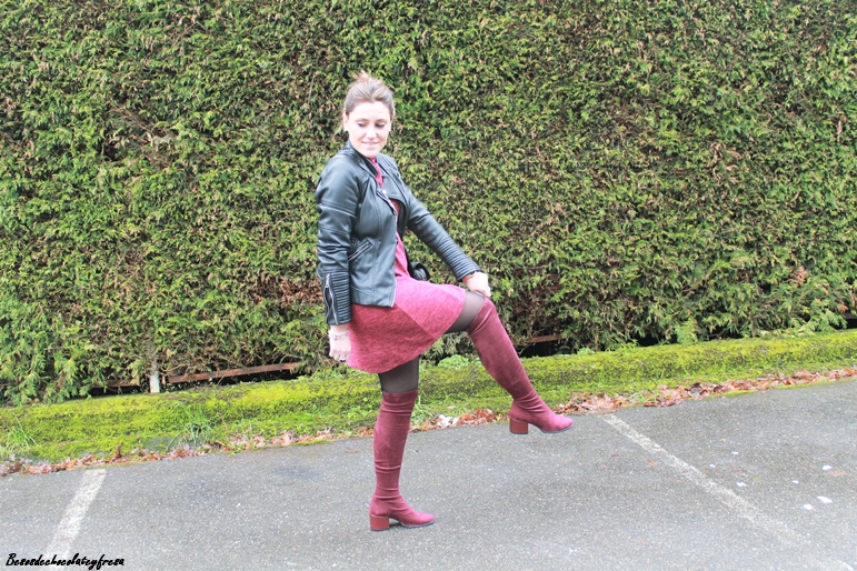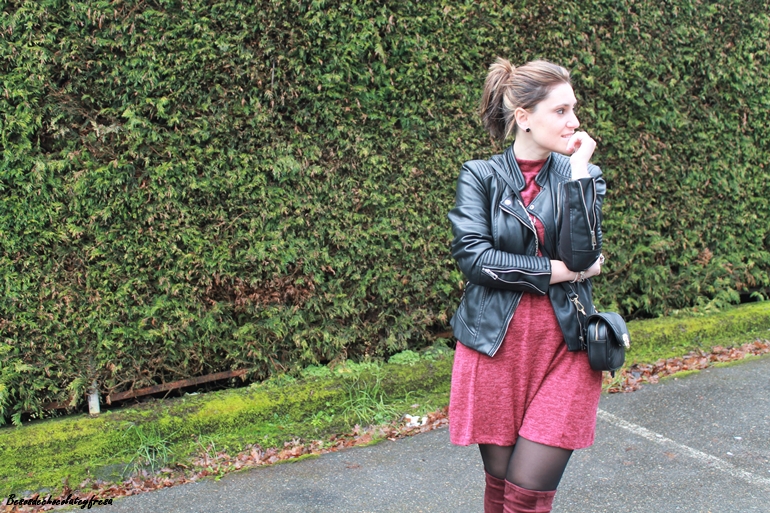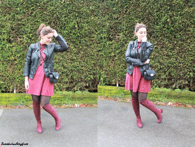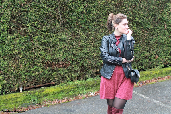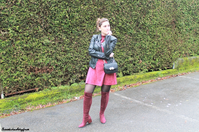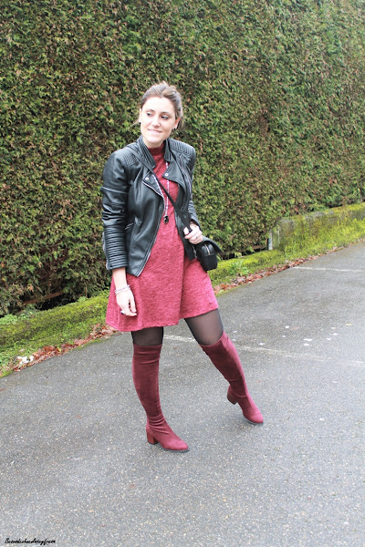 En el outfit de hoy aposte por un total look en burdeos con vestido de punto con cuello chimenea y corte evase junto botas XXL de antelina. Para romper un poco con el color aposté por una biker de polipiel en negro junto con el bolso y una pequeña joya en el mismo tono.