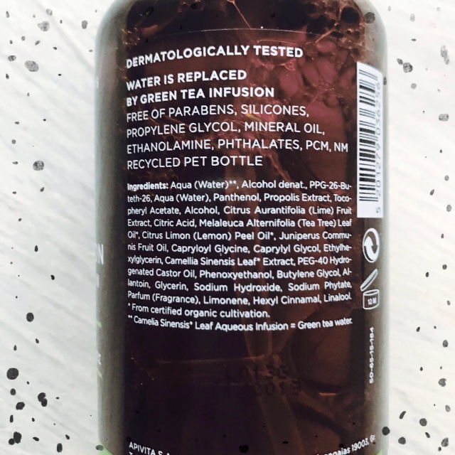 Apivita reemplaza agua por infusión de té verde (mejorar la acción antioxidante (anti envejecimiento) del producto).