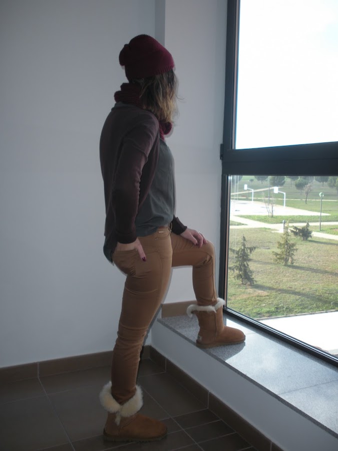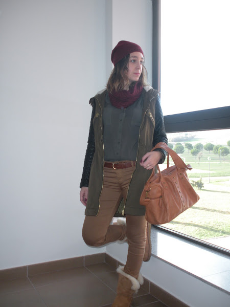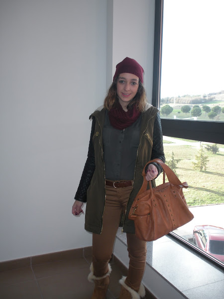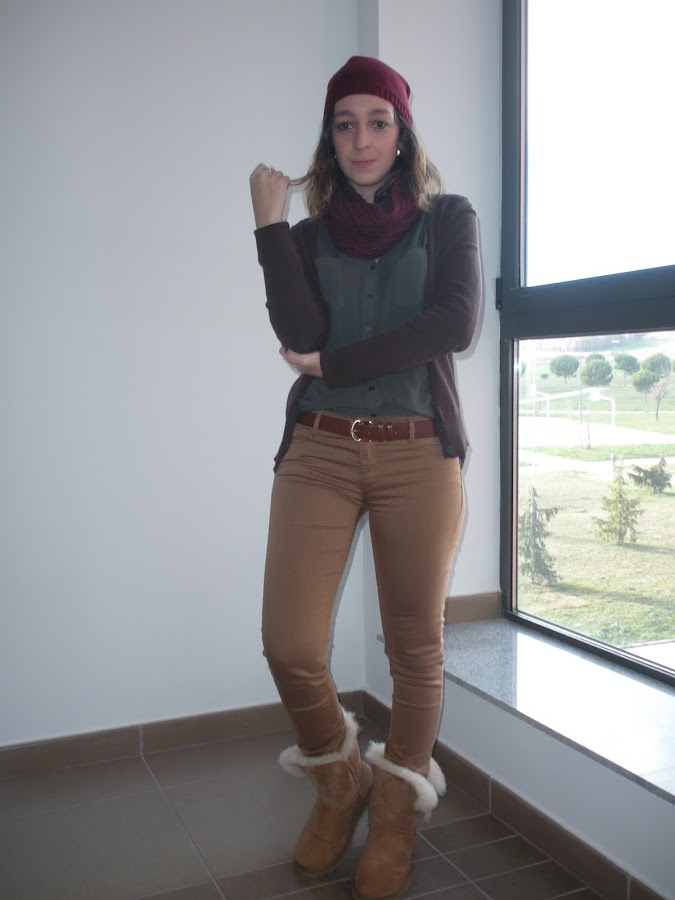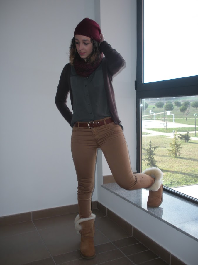 Para una tarde de compras este fue el look elegido, cómodo y abrigadito (como a mí me gusta). Unos pantalones que me cogí en rebajas, una camisa, un cardigan y como complementos bolso y botas en camel y cuello y gorrito en granate.