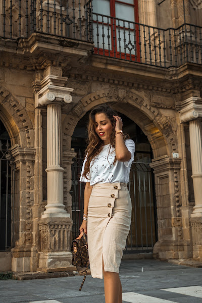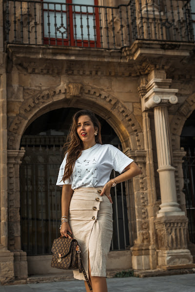 La falda me enamoró, tengo un traje del mismo tono y textura de la misma tienda, y la verdad, cuando vi la falda, no dudé en comprarla. Las faldas de tubo aportan elegancia a nuestros looks, esta es muy elegante y también tiene su rollo sexy gracias a la abertura que deja la pierna sutilmente al descubierto. El drapeado de la cintura con el toque de los botones, estiliza un montón ya que la falda, es de cintura alta. Para no añadirle una camisa y hacer que el look fuese en la misma línea, opté por mezclarla con una camiseta básica en color blanco y con detalles en negro. Me gustó mucho porque si os fijáis, lleva todos los horóscopos ¡súper original!