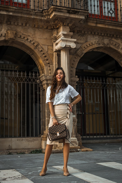 Complementos dorados como los pendientes, el reloj y la pulsera, combinan con el bolso tipo maletín en color marrón con detalles en dorado. Y siguiendo el juego de tonos, los zapatos son parte importante del look y sobre ellos, debemos de ir cómodas a la par que elegantes. Estos salones son de Desireé, siempre os he contado maravillas de esta marca ya que tienen el calzado perfecto para salir un día entero en tacones y llegar a casa con la sensación de haber ido todo el día en zapatillas. Además de ser súper bonitos, en color nude y con la altura justa de tacón. Además estos, incorporan un sistema llamado blue shock que elimina el molesto ruido del taconeo al caminar además de muchos otros beneficios. Al final del post, tenéis un enlace directo a ellos para que podáis ver lo geniales que son.