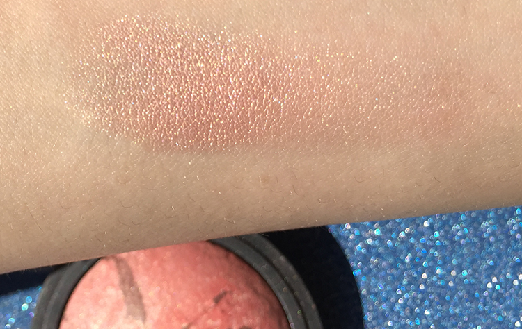 Es un coral con destellos dorados finos y gruesos, que queda precioso en pieles morenas pero que a mi me encanta, personalmente, en la mía, tanto sobre el colorete como usándolo como blush directamente cuando no quieres demasiado tono en las mejillas.