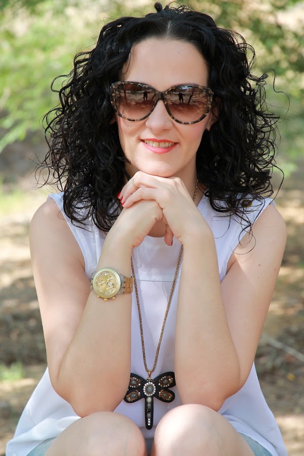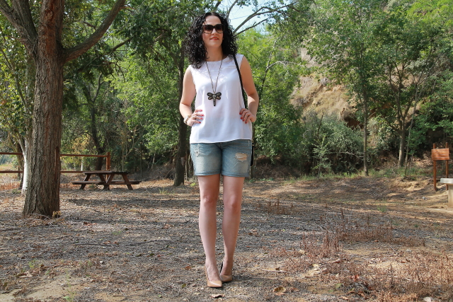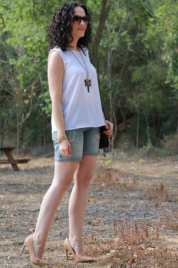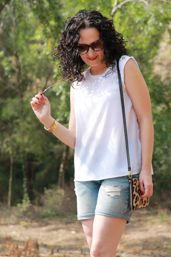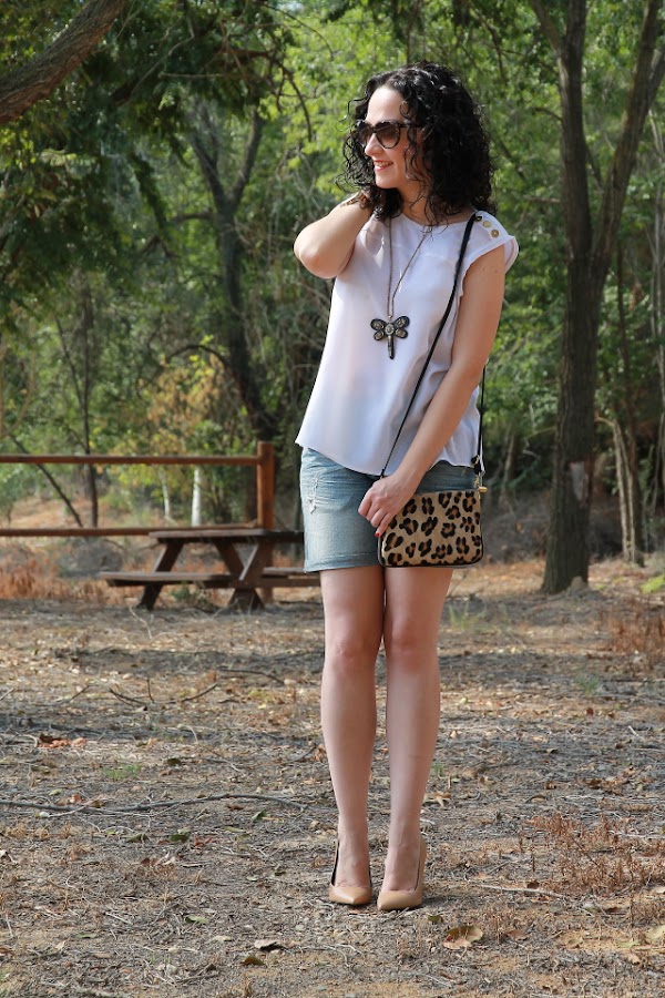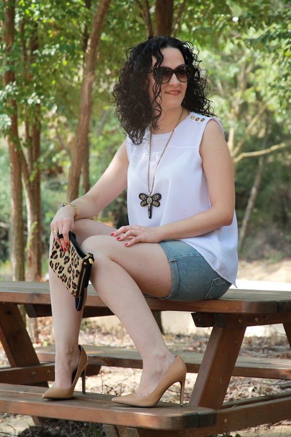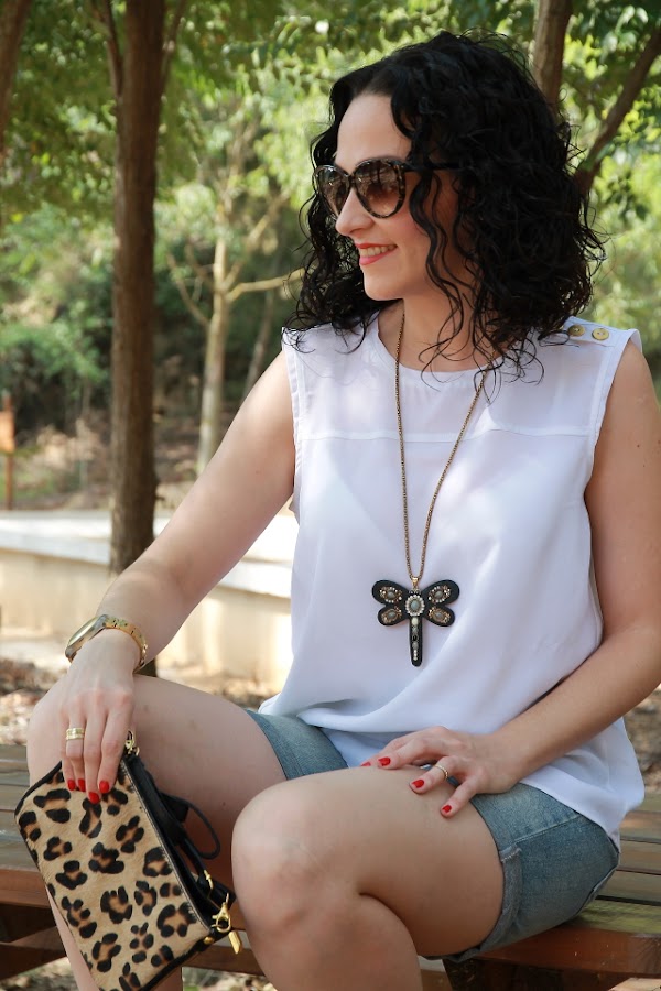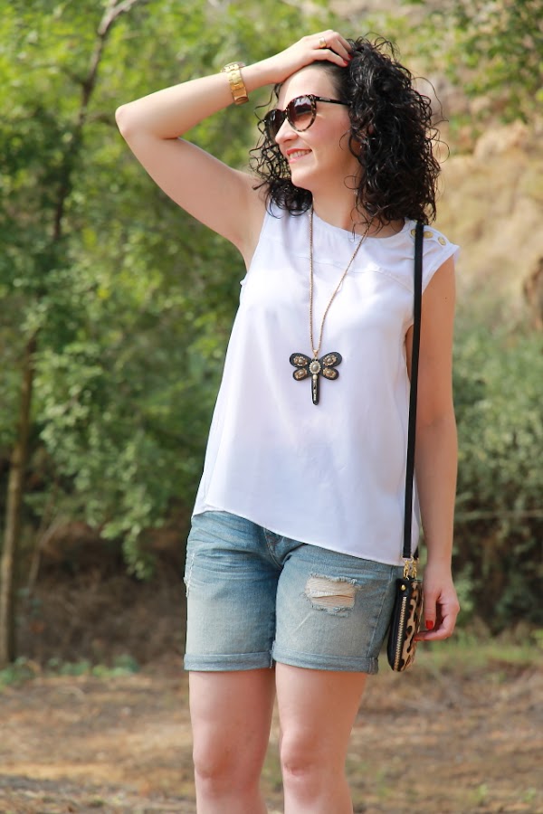 Tenía pensado hacer un DIY con unos jeans que tenía viejos para dejarlos como bermudas, pero cuando vi estos en la web cambié de opinión y me los guardé comprándome los que había visto. Me alegro de la decisión porque aunque eran unos tejanos viejos me siguen gustando y quién sabe si dentro de un tiempo me da por ponérmelos. Hoy los llevo con blusa asimétrica blanca y un colgante con forma de libélula que combina piel y cuentas en colores pastel. El bolso de leopardo, mi preferido entre todos los que tengo con animal print, le da el toque perfecto al look.