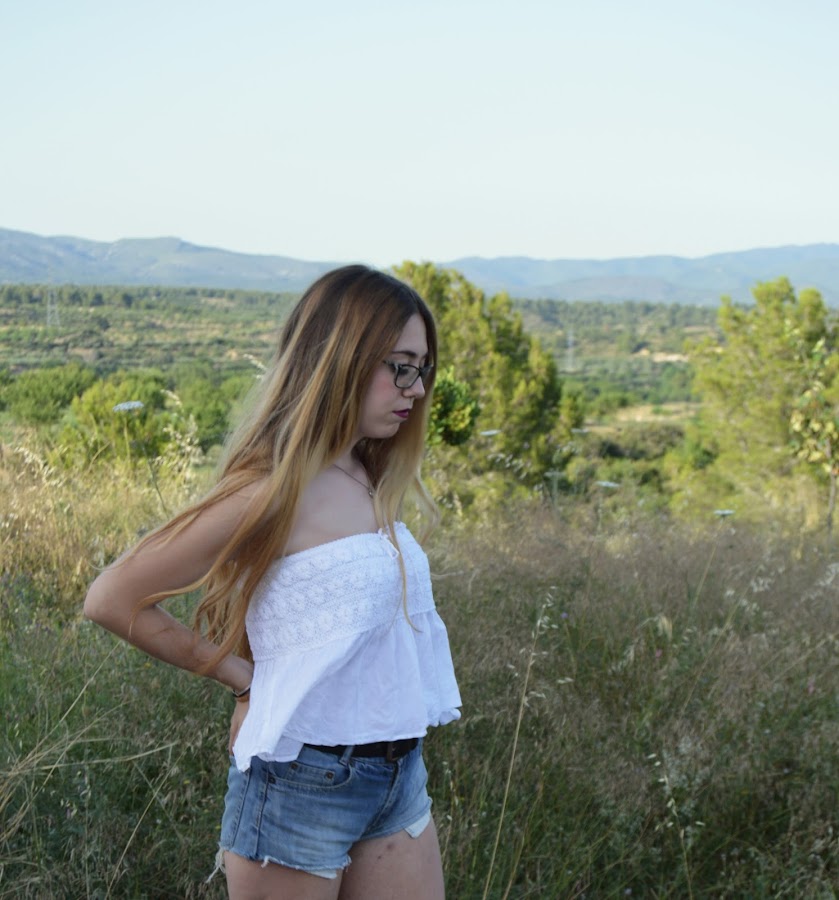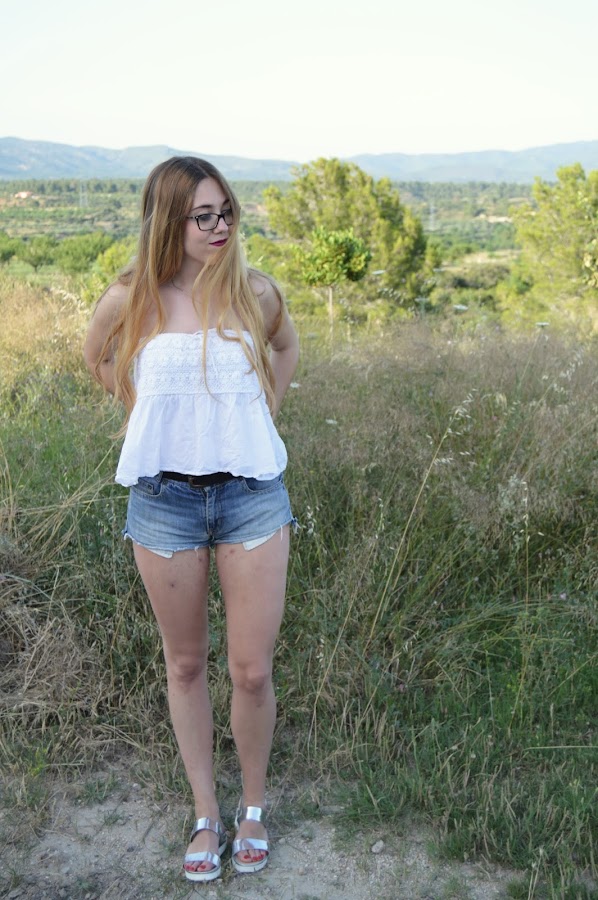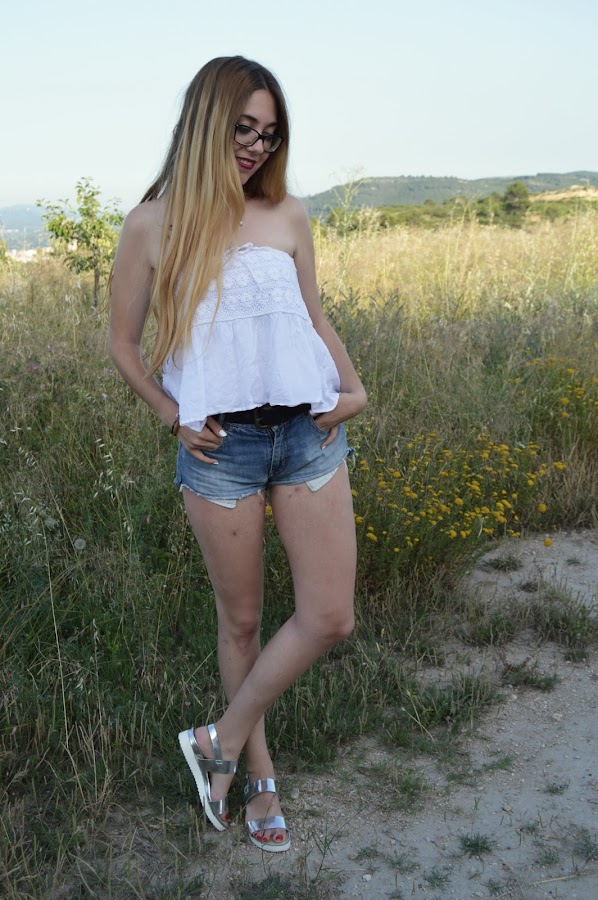 Hoy os traigo este outfit compuesto por unos shorts vaqueros básicos, acompañado de un top palabra de honor blanco, que tiene en la parte del pecho detalles en croché. Como zapatos he escogido mis sandalias plateadas que ya saqué en el post anterior, que creo que a un look básico le aportan ese toque que lo hace más especial. En cuanto a los complementos simplemente llevo una cadenita de plata con un brillantito.
