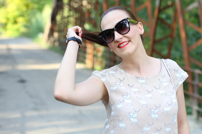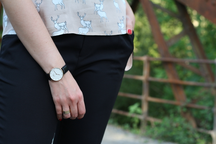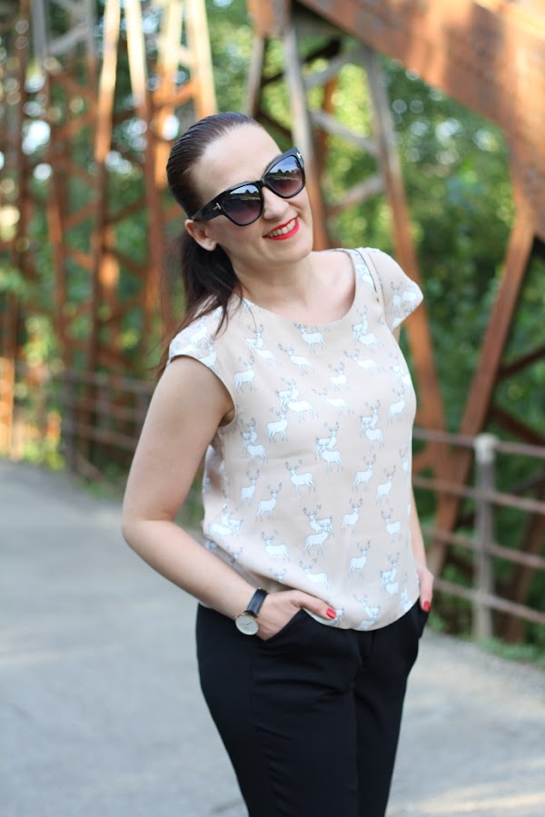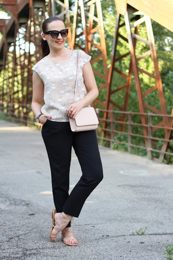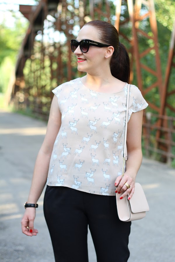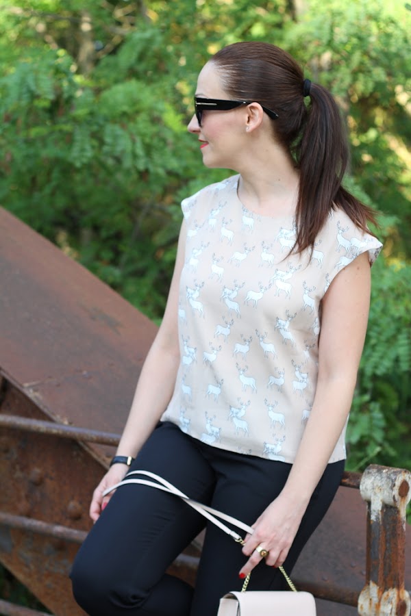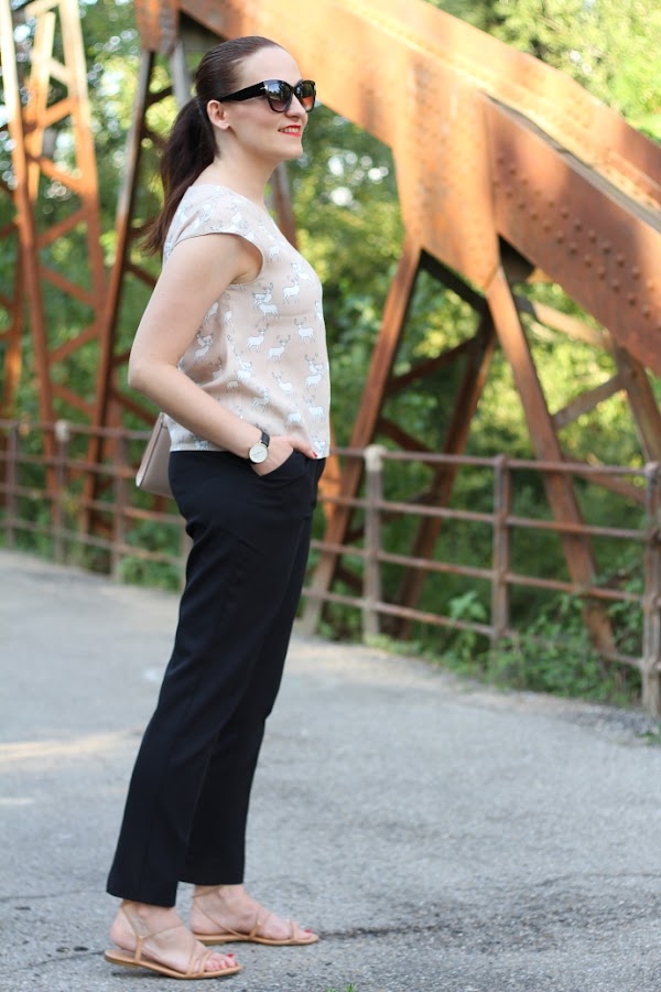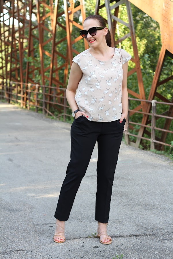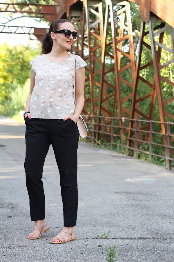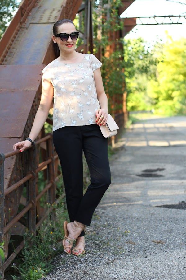 Cuando este verano me compré el dos piezas de ciervos de Zara no creía que le iba a dar tanto uso. Juntas las dos piezas las he llevado bastante (en breve os lo mostraré por aquí), pero por separado es como más me las he puesto. Si en este post os mostraba un estilimo con las bermudas hoy os enseño un look con el top. Lo he combinado con unos pantalones negros de pinzas y corte tobillero, este tipo de pantalón nunca falta en mi armario. Y para los complementos tanto en el bolso como para las sandalias romanas me he decantado por el nude.
