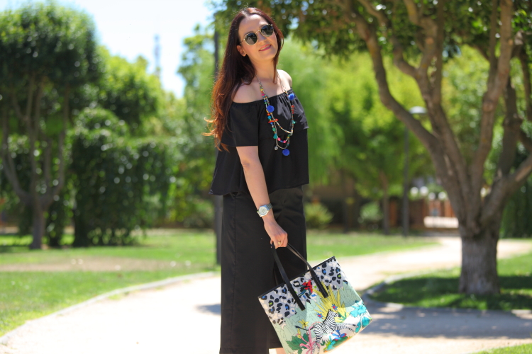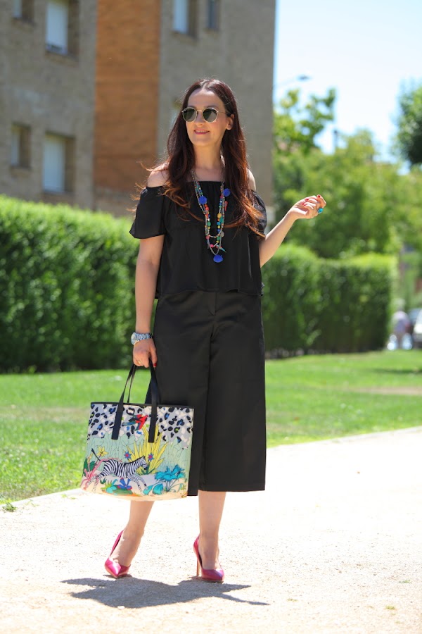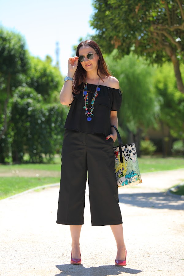 Parece que últimamente consigo huir de mi querido negro en mis looks, pero si, al final es inevitable y vuelvo a caer. Que queréis que os diga, pues si, me gusta y mucho, además no me disgusta como me queda. Hoy lo llevo en un look total black en el que estreno tanto el top off the shoulder como los culotte. No me atrevía con este tipo de pantalones hasta que para las rebajas decidí hacerme con unos. Ahora que ya los he probado me gustan, así que no dudo que este otoño invierno entre alguno más en mi armario.