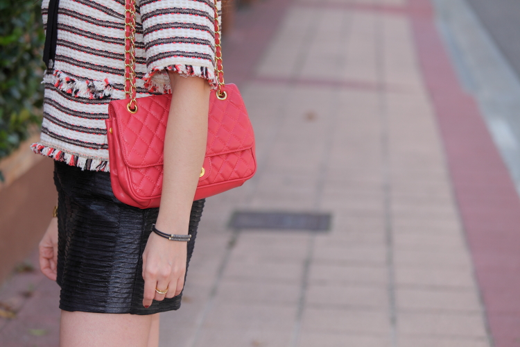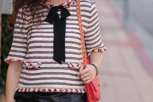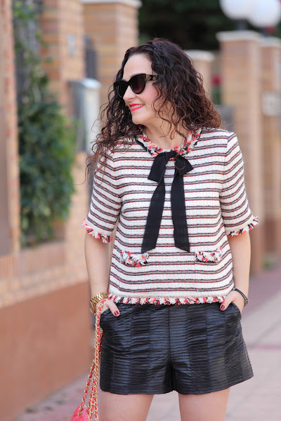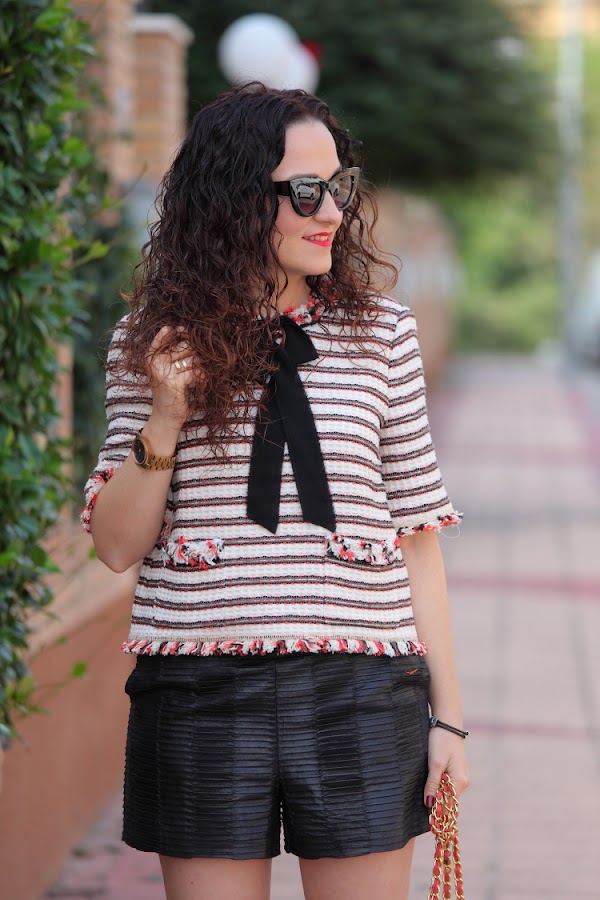 Loquita me vuelve este tiempo, un día hace frío y al día siguiente te encuentras un día completamente primaveral. Y así estoy yo, encadenando un resfriado tras otro porque ya no sabes como acertar con la ropa. Un ejemplo son las fotos de hoy, las hicimos hace un par de domingos que amaneció un día espectacular con unas temperaturas buenísimas. Aproveché y me puse este top estilo Chanel que compré en verano pero que todavía no había estrenado porque para llevarlo entonces me daba mucho calor. Lo combiné con unos shorts de piel y zapatos estilo Valentino.