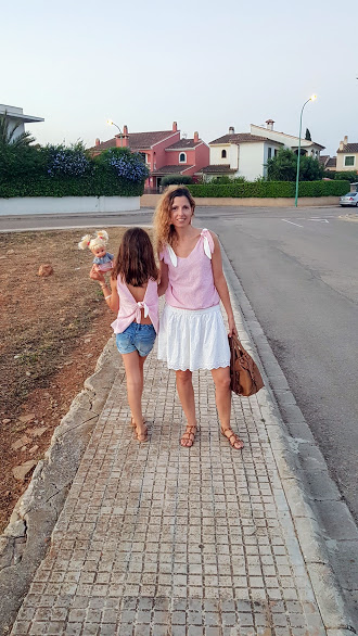 Para la mi el top de rayas es de tirantes y con tela a rayas sólo por la parte de delante. Eso sí, con unos lazos iguales al de Paula en la espalda.