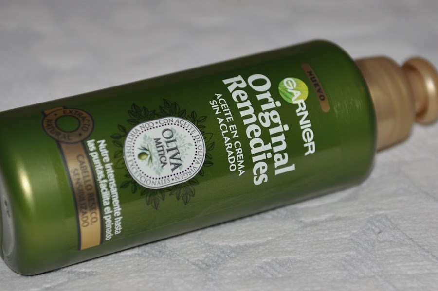 Aceite en crema de la gama "original remedies" de Garnier, con aceite de oliva.Este producto lo compré sin mucha fé en él ya que su precio es inferior a dos euros,pero tengo que decir que precisamente la relación calidad/precio es muy buena ya que desenreda las puntas,las deja muy suaves y con un olor riquísimo.También se lo aplico a mis hijas cuando salen de la ducha porque las facilita el peinado,ya que tienen el pelo muy fino y se las enreda las puntas con bastante facilidad.