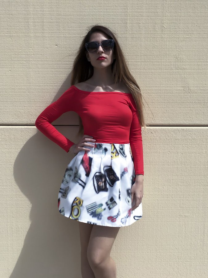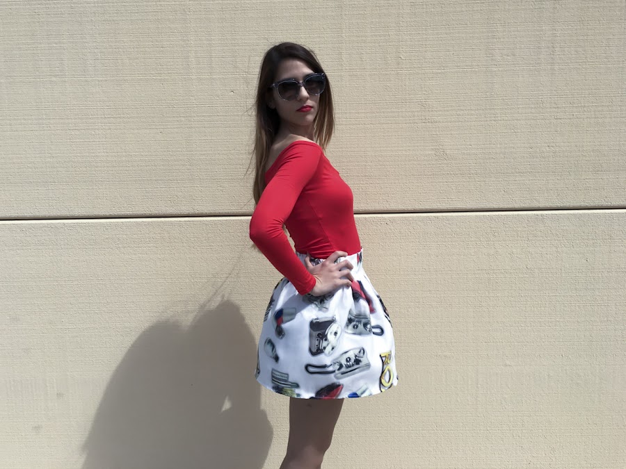 And were going to look !! Today I have chosen a balloon skirt with a super original lettering, which makes a blur in rojoa white with touches of color. I have combined with a top red shoulders discovered, some black stilettos and my sunglasses Missoni Veo Veo Optical Center! I hope you like the look today! Be happy and see you in the next post!