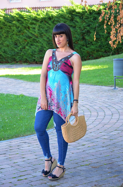 Lo he combinado con estos vaqueros que ya me habéis visto un montón de veces porque son de mis favoritos porque estilizan un montón la figura. El bolso y las cuñas ya los tenéis muy vistos también jajaja.