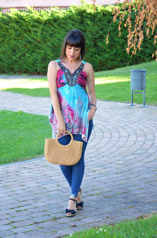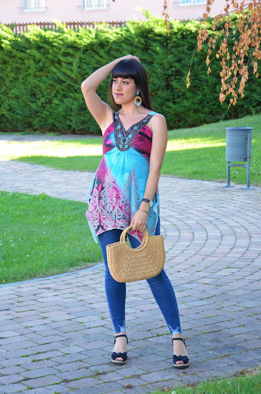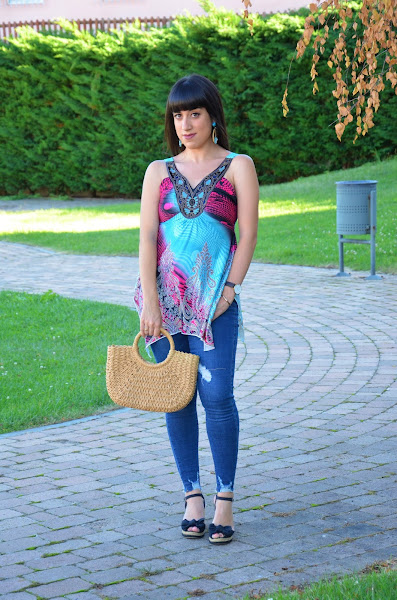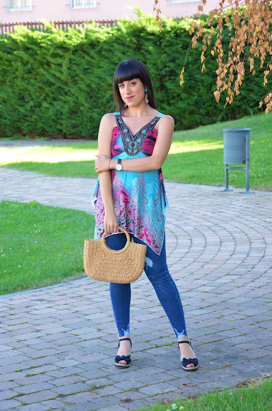 Este top es una de esas prendas de uno de aquellos paquetes que se perdieron con el confinamiento y me llegaron un siglo más tarde. Pero por lo menos llegó. Es de Dresslily y tiene una combinación de colores que me encanta para el verano. La parte del escote, de estilo tribal, sin duda es lo que más me gustó.