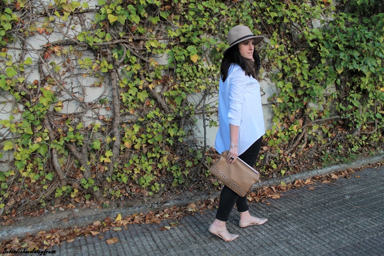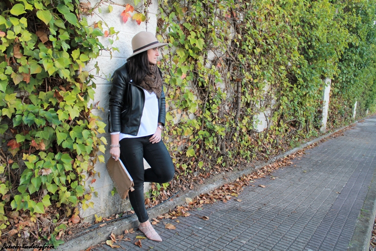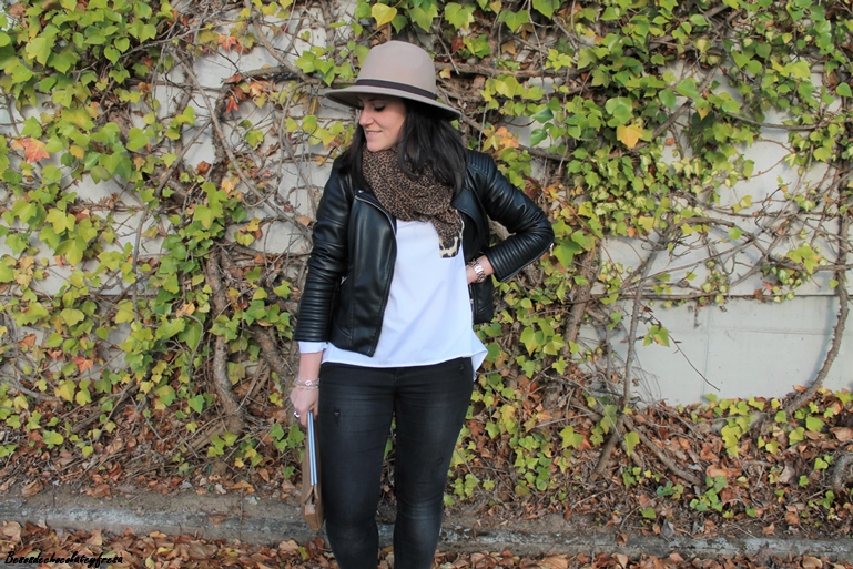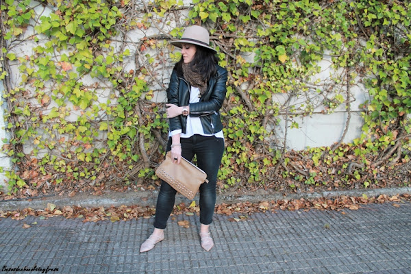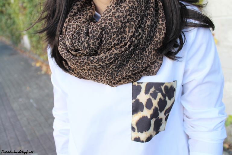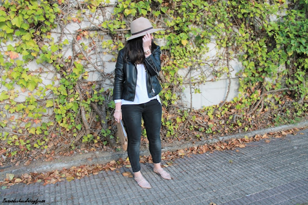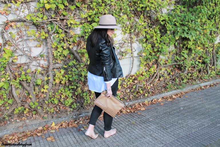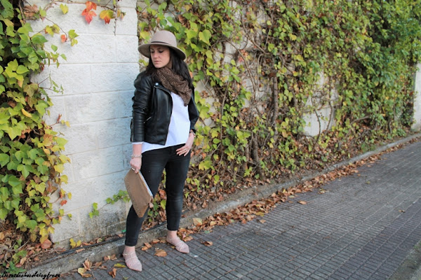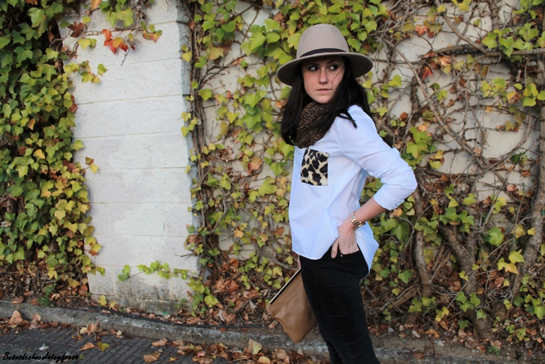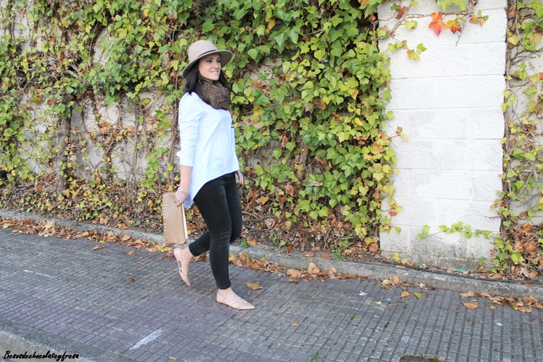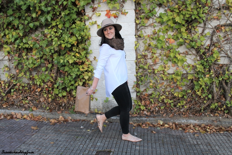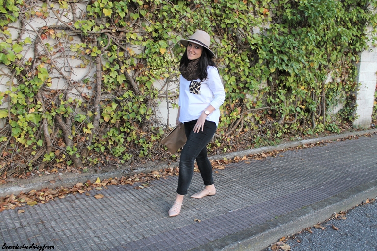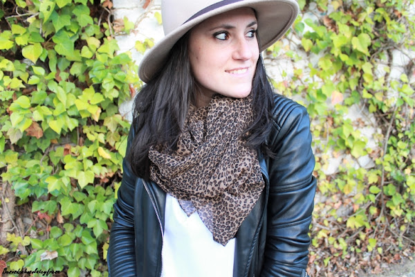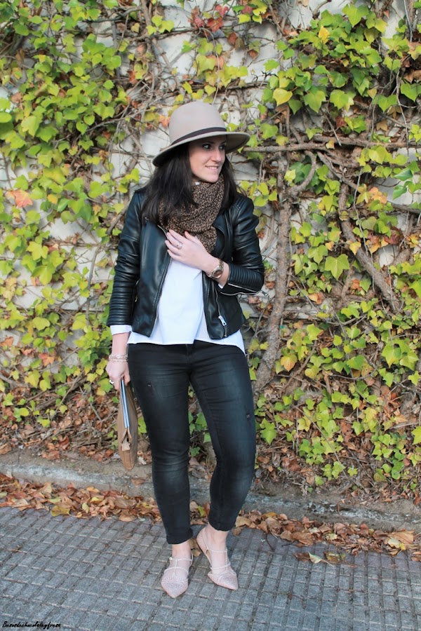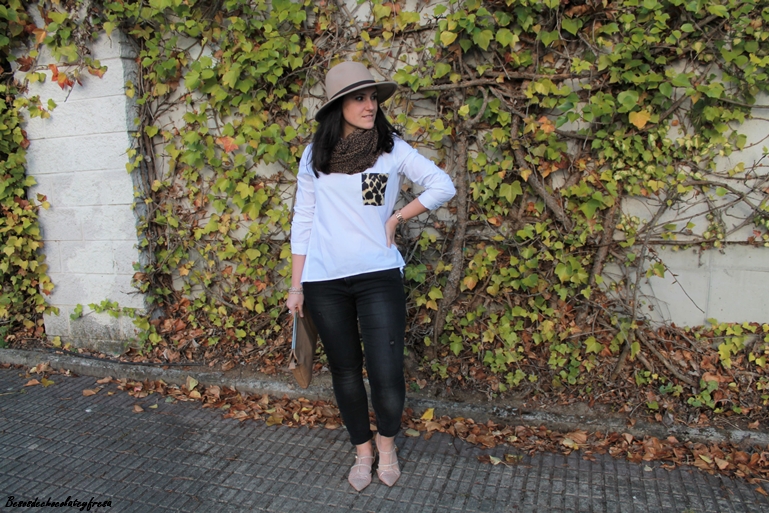 En esta ocasión llevo camisa de corte oversize con detalle de animal print en el bolsillo de la parte delantera. Se trata de una camisa cómoda y fresquita para estos días que ya son más propios de la primavera, sin botones pero abierta con cuello pico. El resto de prendas ya son conocidas y de otras temporadas como la biker negra, jeans negros, bolso y sombrero en nude, animal print en el cuello con el fular y sandalias de brillos (si por fin mis pies empiezan a ver la luz, que ganas tenía)
