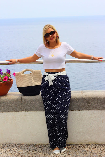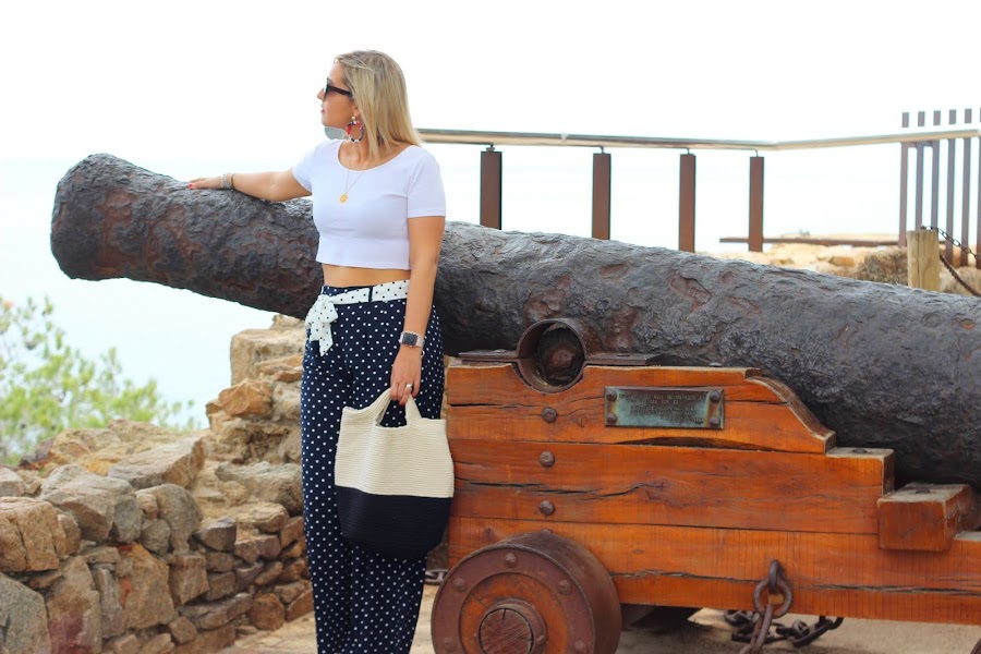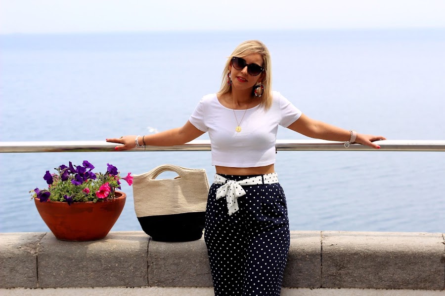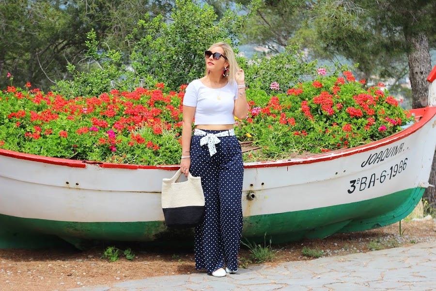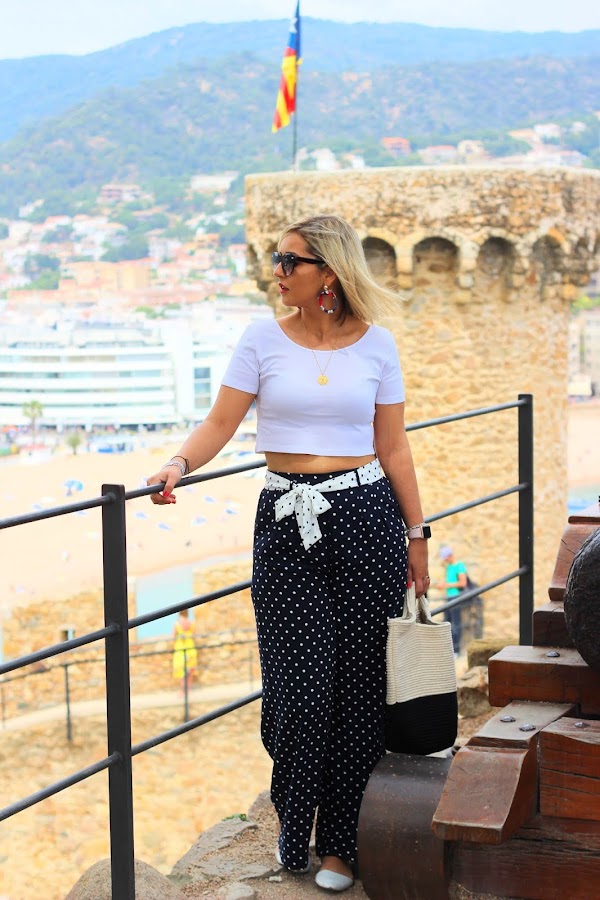 El look que elegí para visitar este pueblecito fue mis nuevos palazzo de topos, que es una prenda que me encanta para el verano y que combiné con un crop top blanco. Los accesorios del look fueron unas sandalias blancas y mi bolso de rafia en blanco y negro que combina genial con todo, creo que se va a convertir en mi nuevo bolso favorito del verano.