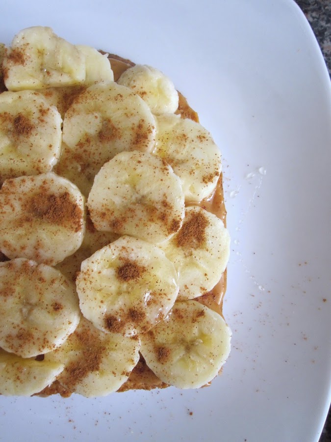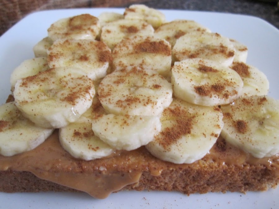 Ingredientes: pan de molde integral + mantequilla de cacahuetes + banana + miel y canela.