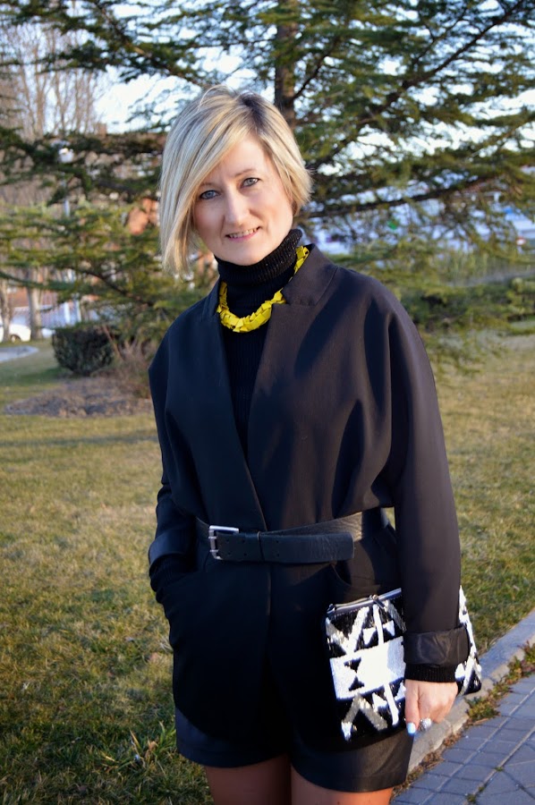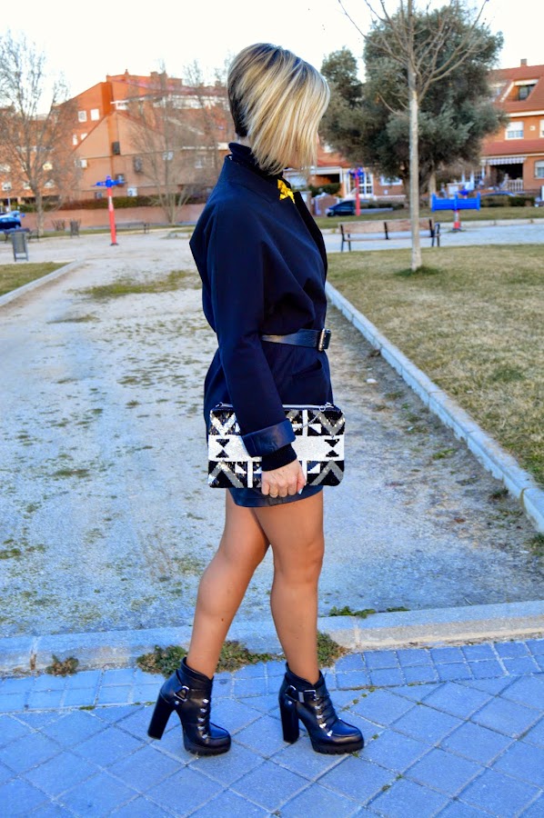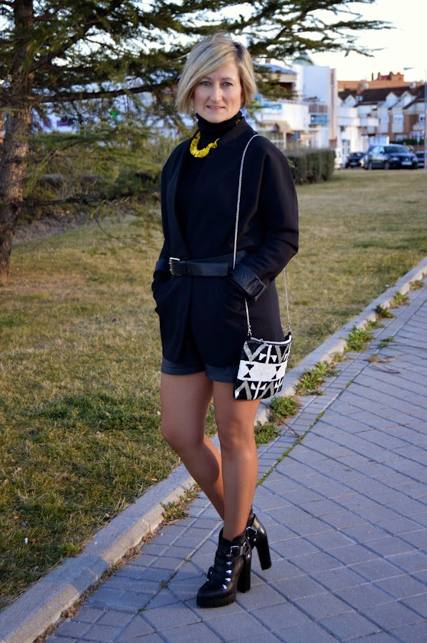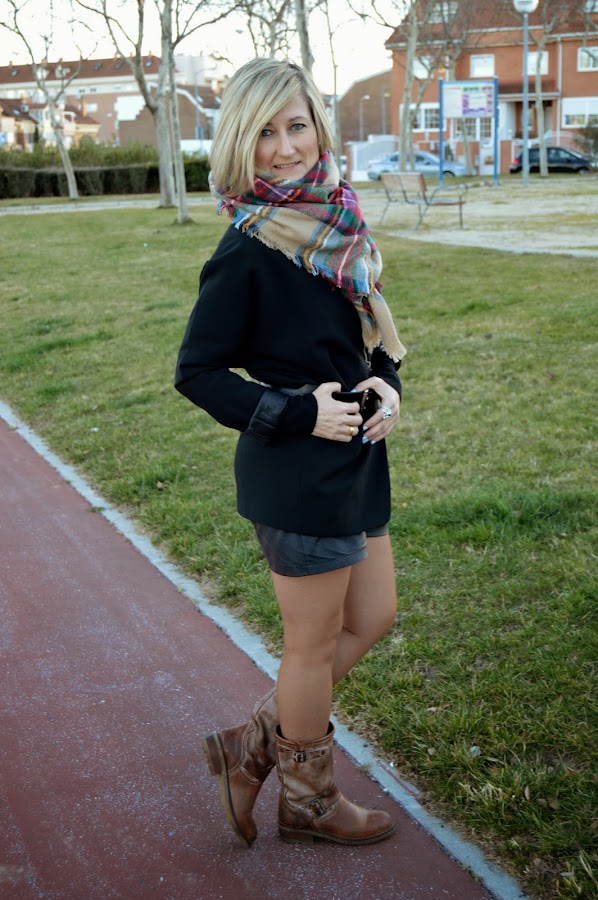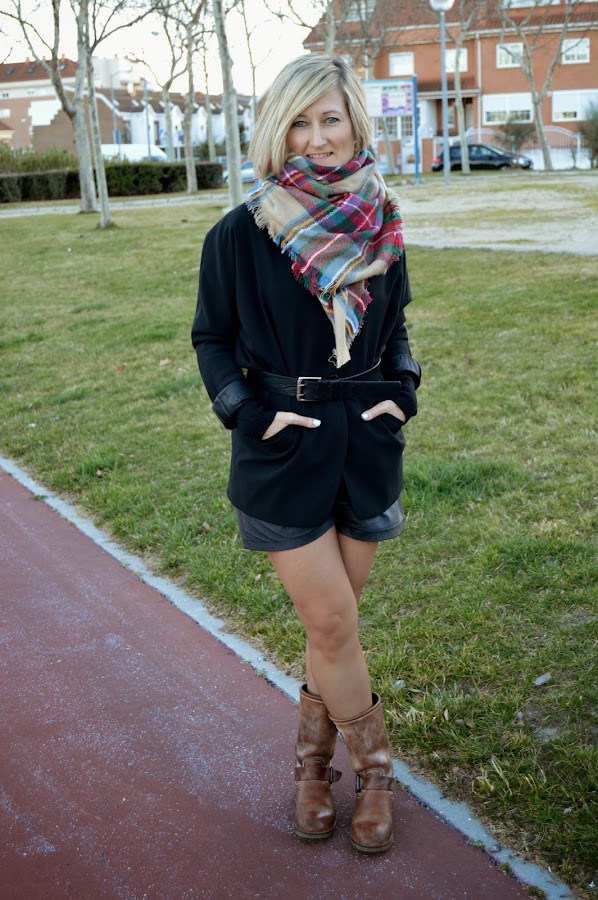 Íbamos a salir por la noche, pero estaríamos fuera de casa toda la tarde, y claro está, no estaba dispuesta a estar subida todo el rato en los andamios. Como veis elegí un total black. Por la tarde lo llevé con maxi bufanda y mis súper botas todo terreno. Por la noche cambié los complementos et voilà...