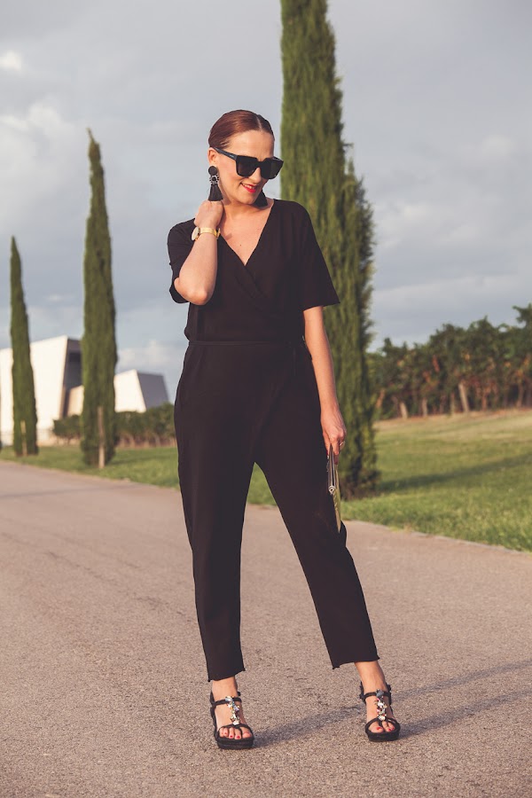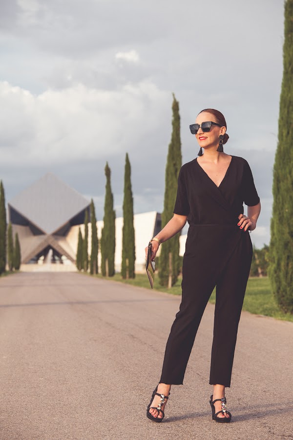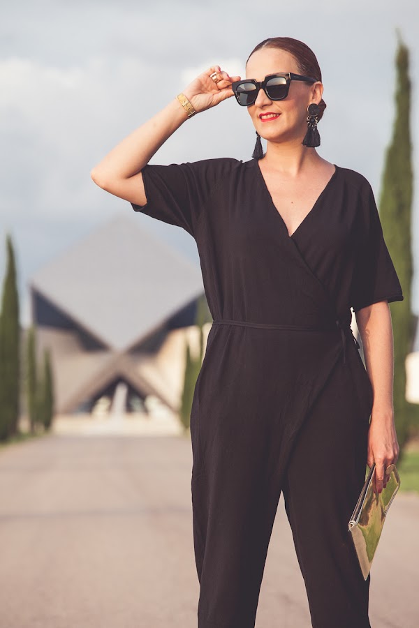Hoy me ha resultado realmente difícil elegir las fotos que os iba a enseñar. Si siempre digo que le tengo que dar las gracias a mi chico por las fotos que me hace, hoy mucho más porque me parecen todas preciosas. En ellas llevo un mono negro que combiné con maxi pendientes de pompón negros, clutch dorado y unas esparteñas de cristales que me parecen preciosas.