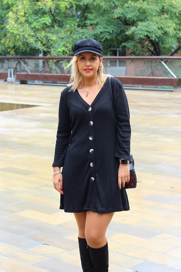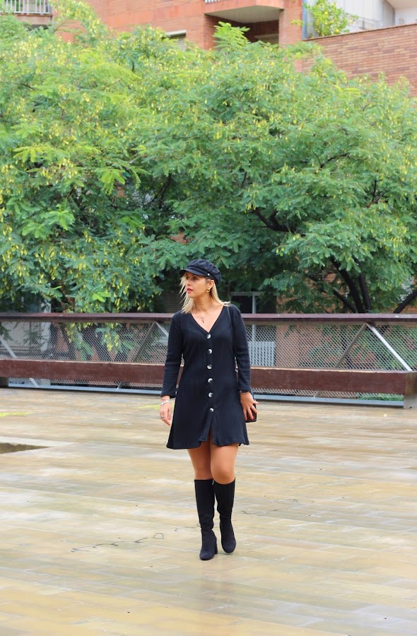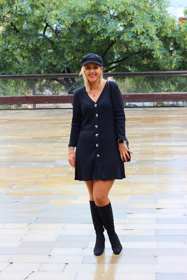 Today I show you a very easy and wearable outfit. I love knitted dresses for the winter, because theyre very comfy and its the kind of garment that its perfect for the days that you dont know what to wear. In the outfit of the day, I wear my new black knitted dress with buttons with a high black boots and a navy cap. A perfect outfit for infinite situations.