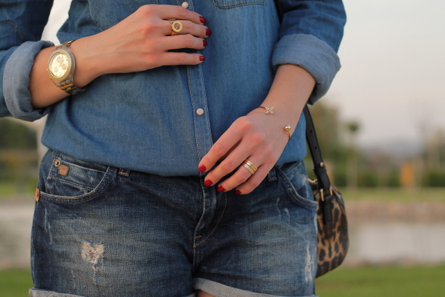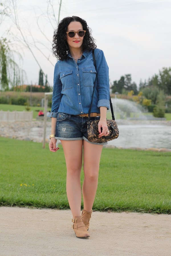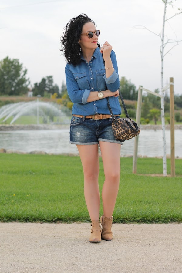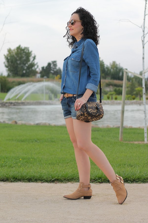 En mis redes sociales pudisteis ver que la semana pasada disfruté de unas vacaciones con mi marido recorriendo el norte de España. Este fue el motivo de que ayer no hubiera entrada en el blog, el cansancio de la vuelta a casa y lo tarde que llegamos hizo que me fuera imposible, así que ya perdonaréis. Pero bueno, no me lio más y me paso a mostraos el outfit de hoy, ideal para estos días cálidos que estamos teniendo aunque por aquí parece que hoy ha querido refrescar un poquito. Un total denim con camisa y shorts tejanos, bolso con animal print y botines cut out camel.