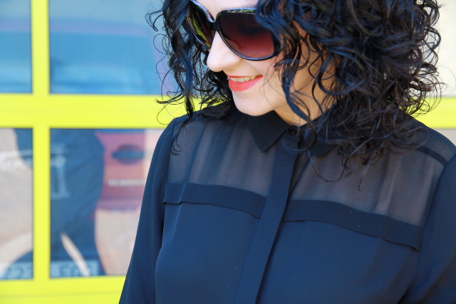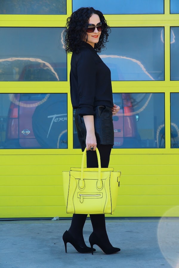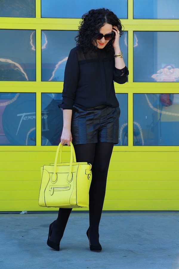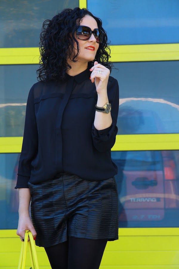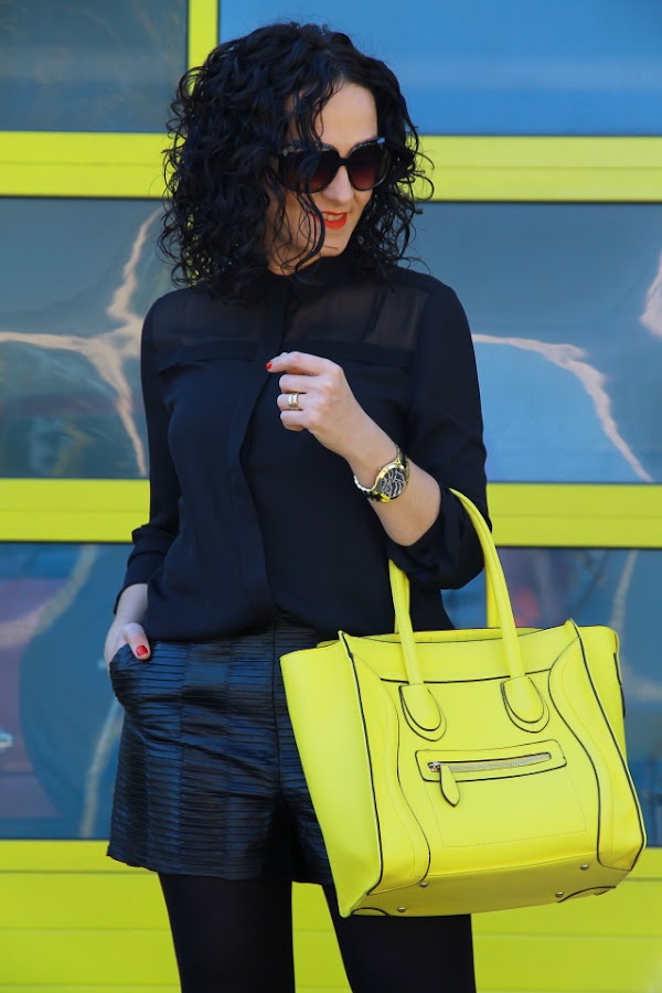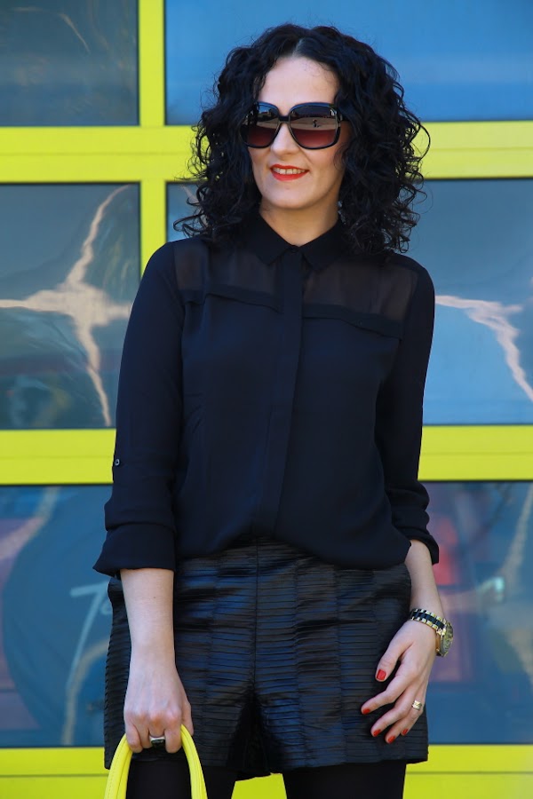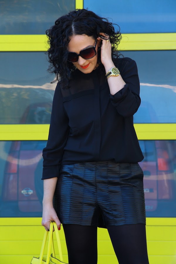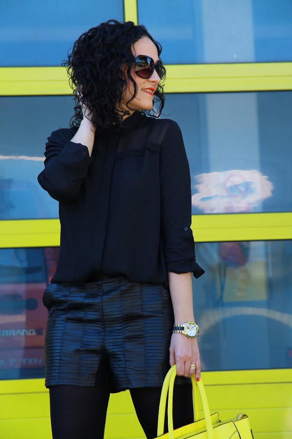 Otra vez un total look negro, no se que tendrá este color pero es que me gusta a rabiar y nunca llega a cansarme. Ambas piezas por separado me gustan, pero si combinamos la camisa que lleva parte de transparencias y mis shorts de piel favoritos el resultado es perfecto. Para romper el look monocromático nada mejor que mi bolso amarillo, cada vez que me lo pongo me gusta más.