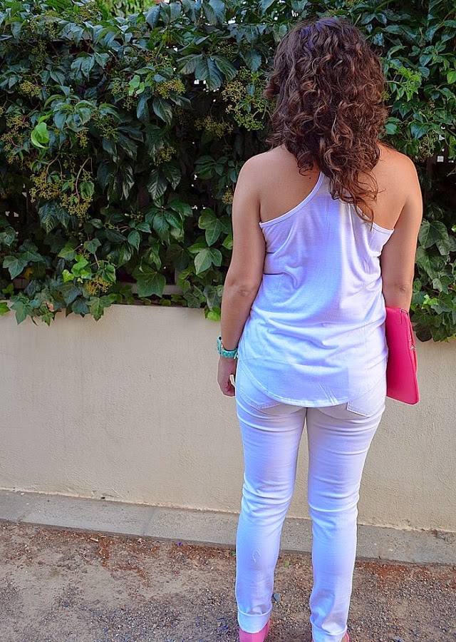 Holaaa!! Ya es viernes y hoy por fin os enseño un look, que llevo una semana con eventos, sorteos, colaboraciones y reviews...¿Os acordáis que la semana pasada Custo Barcelona sacó una mini colección para Lidl? Pues yo fui una de las afortunadas en poder encontrar mi talla!Llevo una S y queda holgadita. Y bueno lo de afortunada...más bien espabilada y madrugadora jeje, a las 9.30h ya estaba en el supermercado cotilleando y aprovechando para comprar cuatro cosas para casa y hacer algún que otro pastel. Ya sabéis que Lidl tiene muy buenos productos para repostería.Os enseño este total look by Custo Barcelona. La camiseta es una monada, por los colores es ideal con cualquier cosa y además muy veraniega. Yo la he utilizado ya con unos pantalones blancos, rosa fresa y con otros color menta. Hoy os la enseño con los jeans blancos de la misma marca. He combinado los complementos en tonos rosados porque quería darle algo más de color al look, ya que viéndolo por detrás es un total white ¿Qué os parece el look? ¿Os comprasteis alguna cosita?