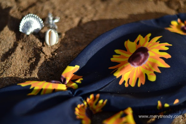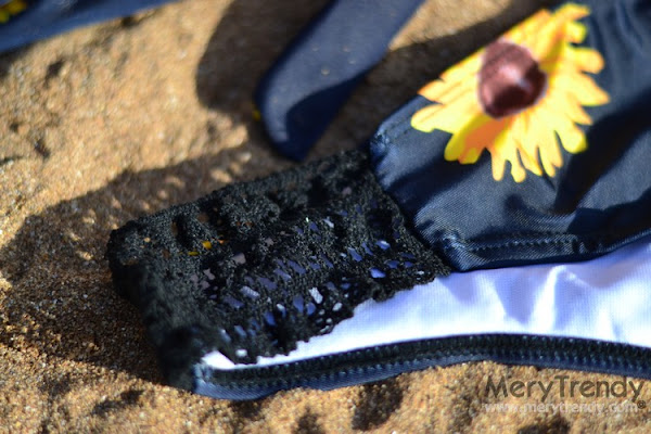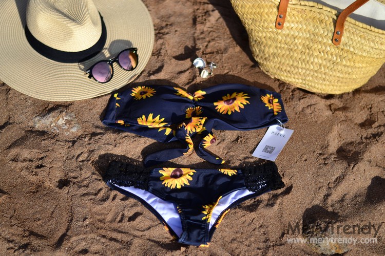 Hoy os enseño un Total Look Playero de Zaful por menos de 40 Euros, formado por un bikini con original estampado de girasoles sobre fondo negro (una apuesta segura si tenemos en cuenta que el print floral está de moda todos los veranos), con escote bandeau (ideal para evitar las dichosas marcas que nos dejan los tirantes cuando tomamos el sol sin bajárnoslos y/o al ir a bañarnos) y braguita de cinturilla baja (con los laterales en crochet)