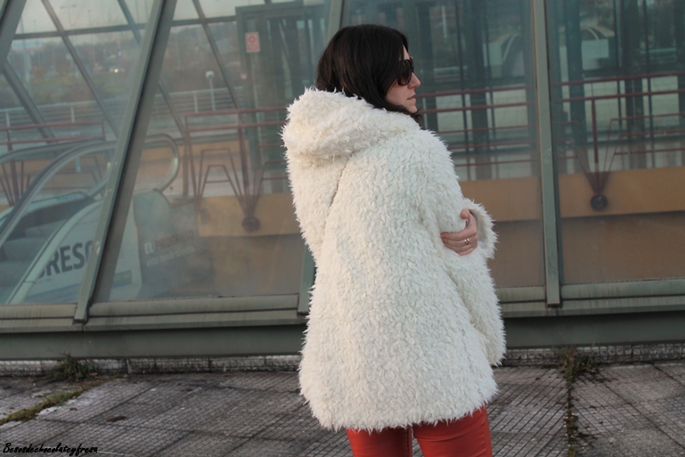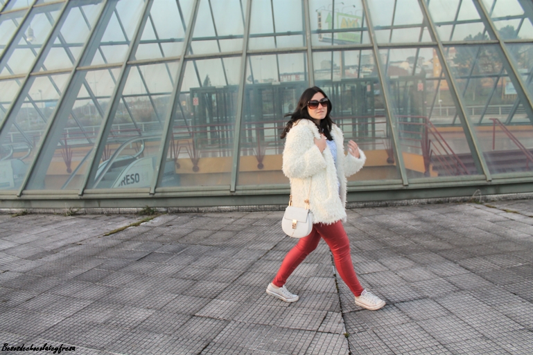 La combinación de rojo con rayas azules me encantó en cuanto me la puse con pantalones encerados de estas rebajas (que ya pudisteis ver en este post) y blusa de rayas en azul y blanco, sometida para darle un toque chic (aquí). Como complementos opté por un maxi collar en rojo y el resto en blanco como son las sneakers, el bolso y el abrigo de peluche (visto también en este post). ¿Qué os parece?