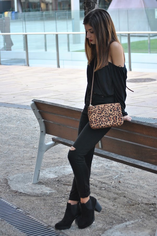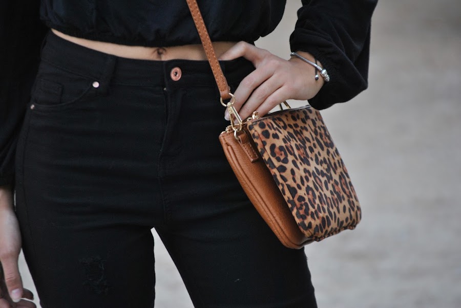 Para complementar el negro total del look, le he añadido un poco de color con el bolso pequeño de leopardo, y los labios rojo potente para darle un poco de personalidad al resto del maquillaje, totalmente simple.