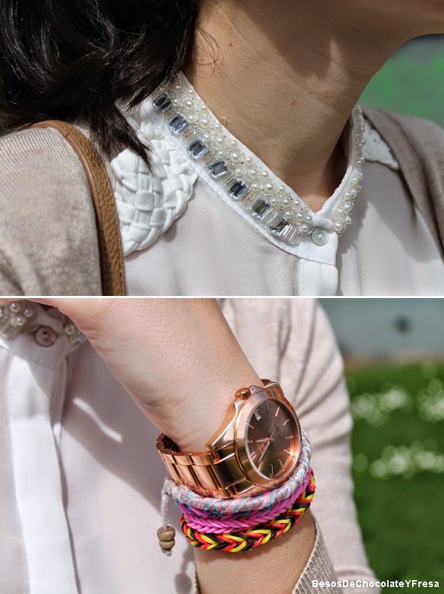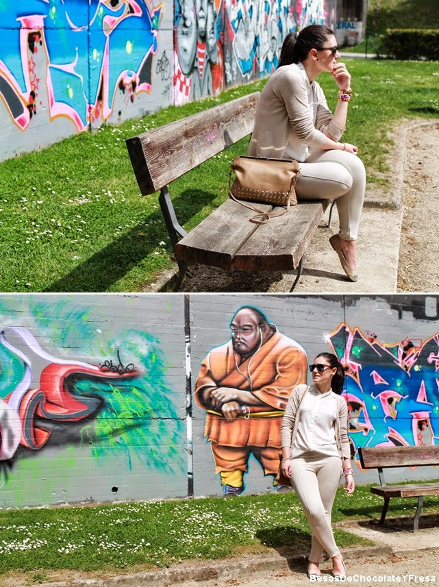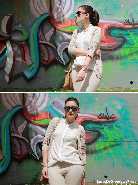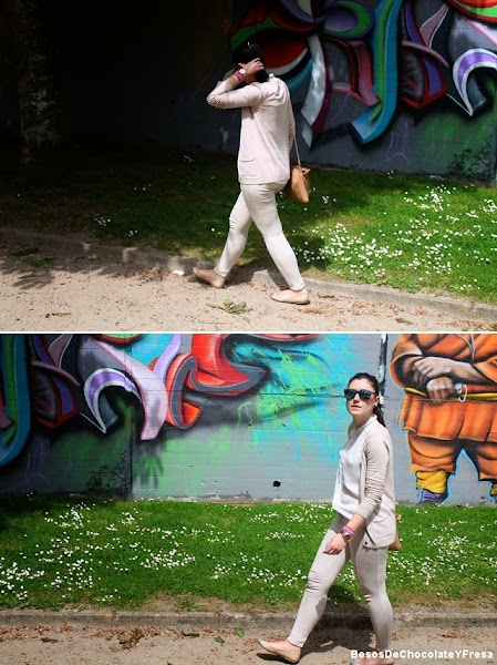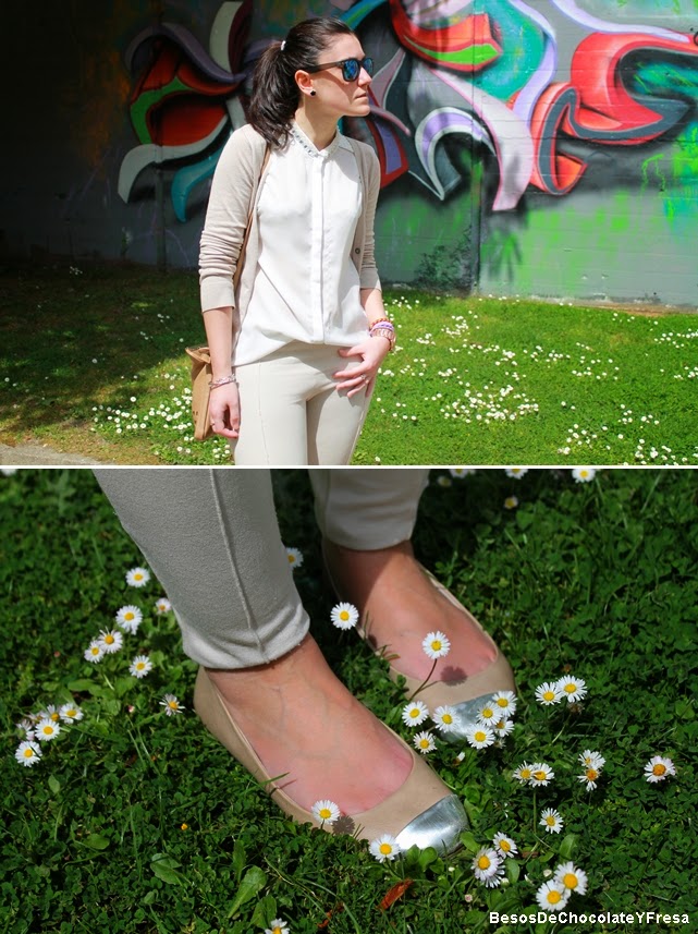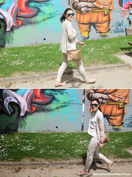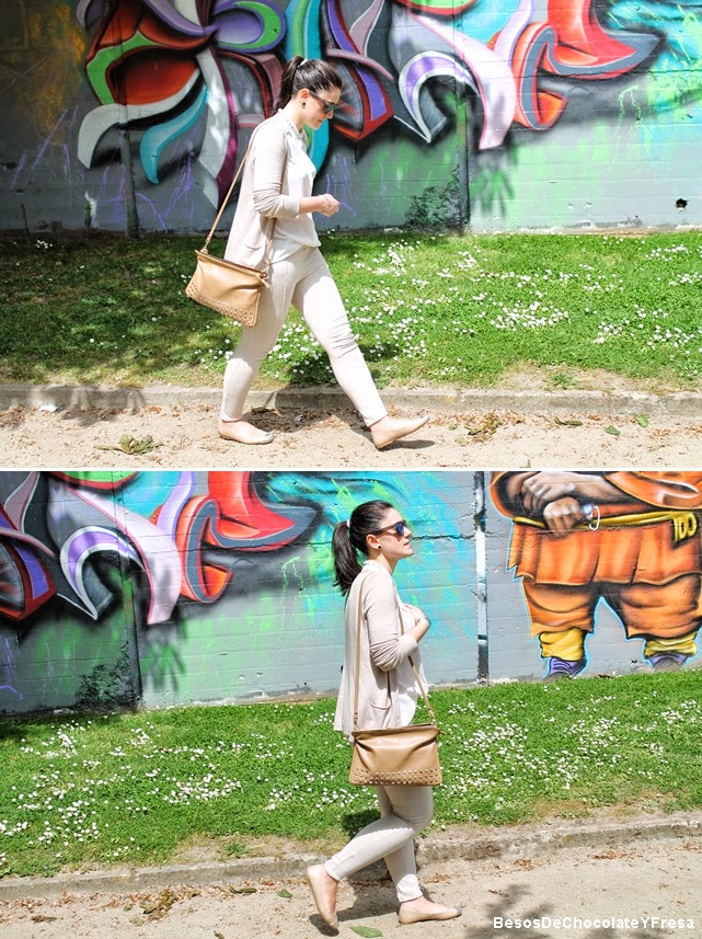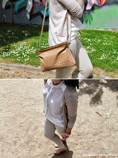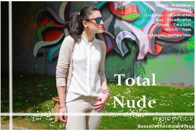 Hola!! ¿Qué tal? Hoy os muestro un outfit total nude, pues llevo leggings, bailarinas, chaqueta básica y bolso bandolera en color nude y para contrastar camisa en blanco con cuello joya.