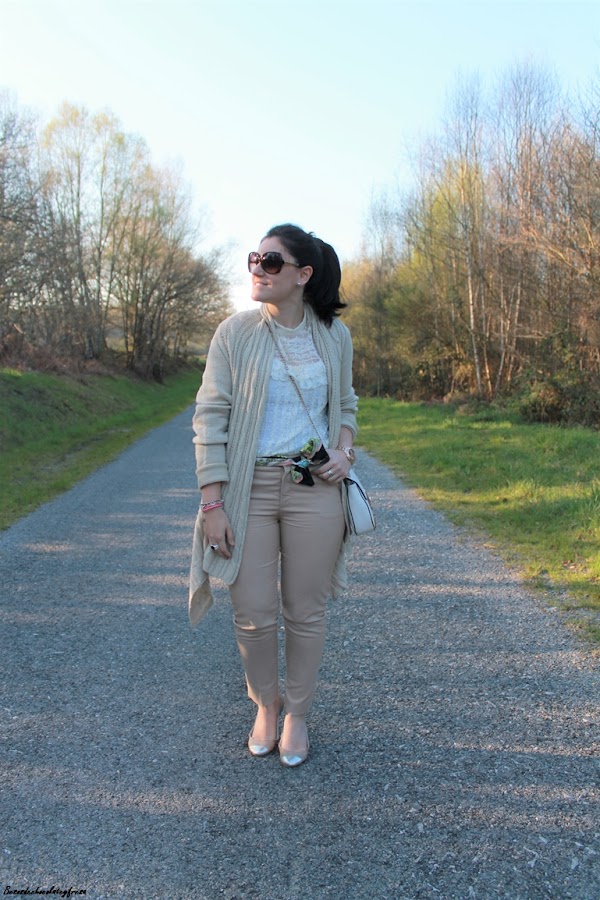 Completo el look con blusa de encaje en blanco roto, sandalias con puntera plateada (una adquisición de hace un montón de tiempo de Zara Kids y que me han salido muy bien y siguen como nuevas tras el paso del tiempo) y cardigan asimétrica