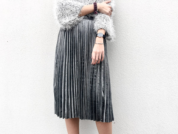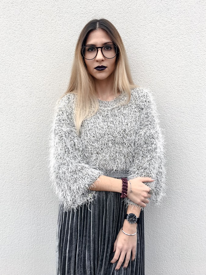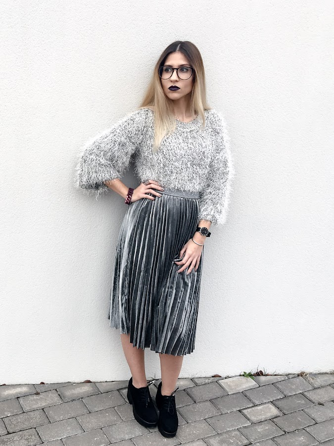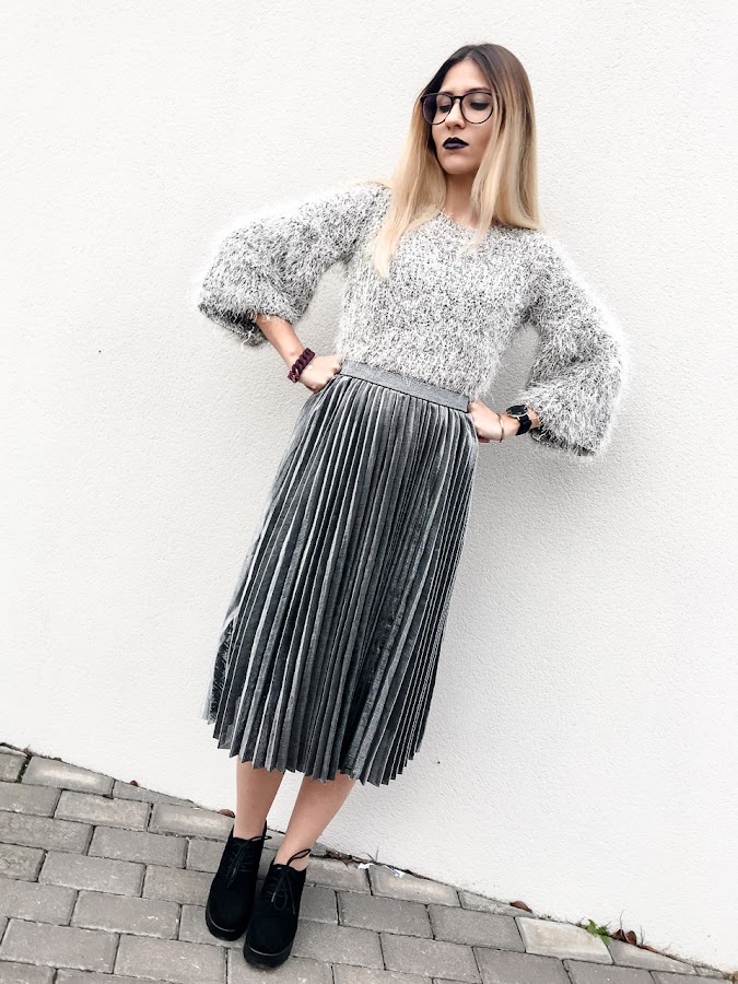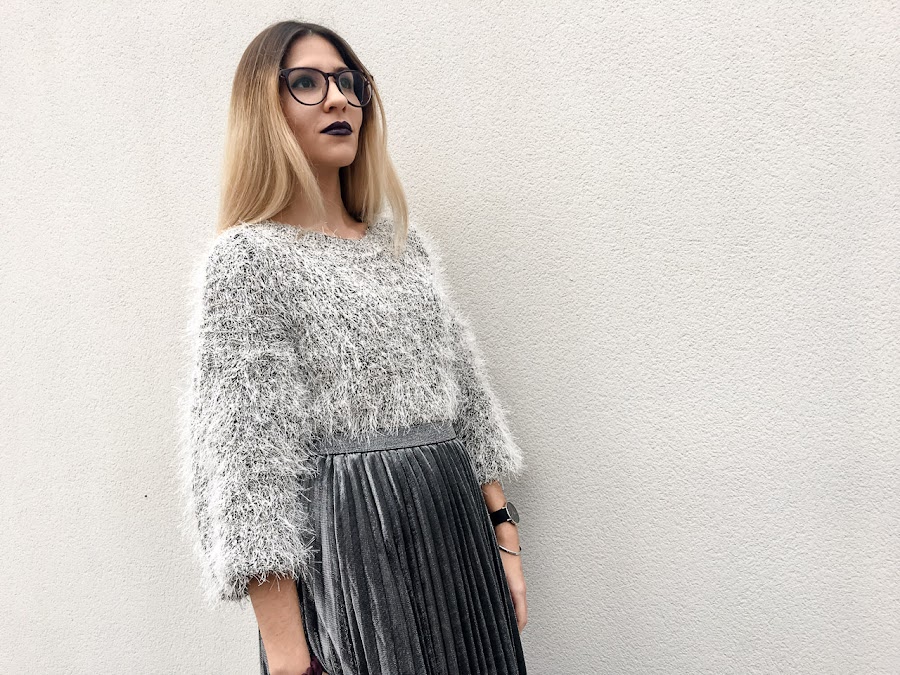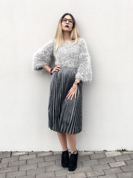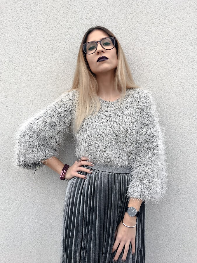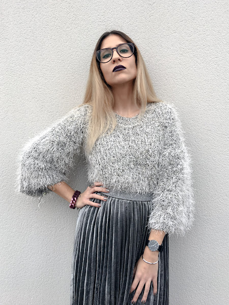 Y os traigo además, un nuevo look! Un total look de SHEIN que brilla por sí solo! Una falda midi plisada plateada y un jersey Crop de color gris y de pelito son los protas de hoy!Como complementos, he elegido mi pulsera de The Rubz, mi reloj ClassicBlack de Daniel Wellington y un color de labios muy especial, solo apto para atrevidas!