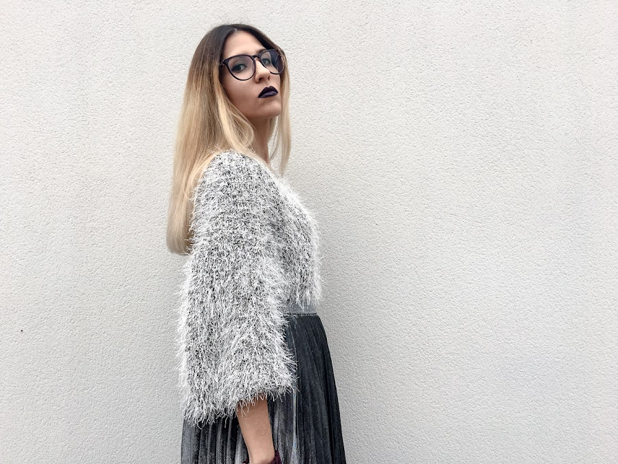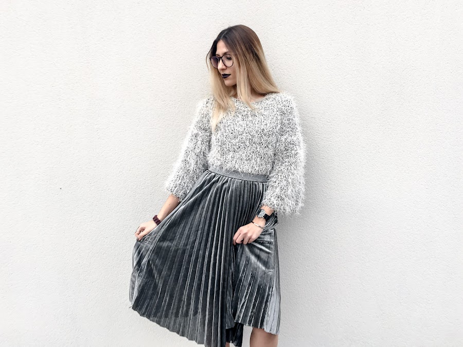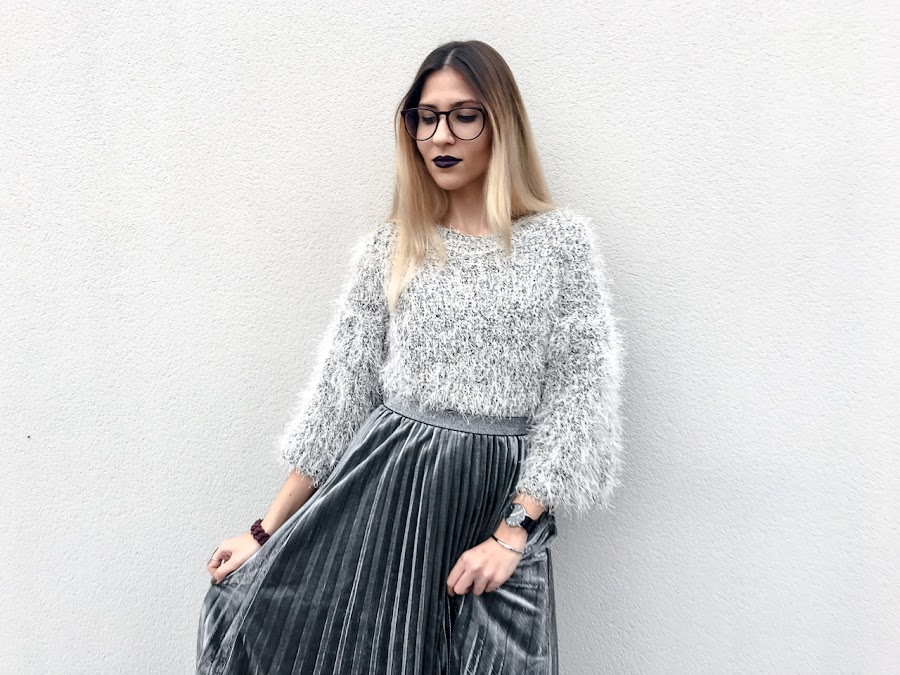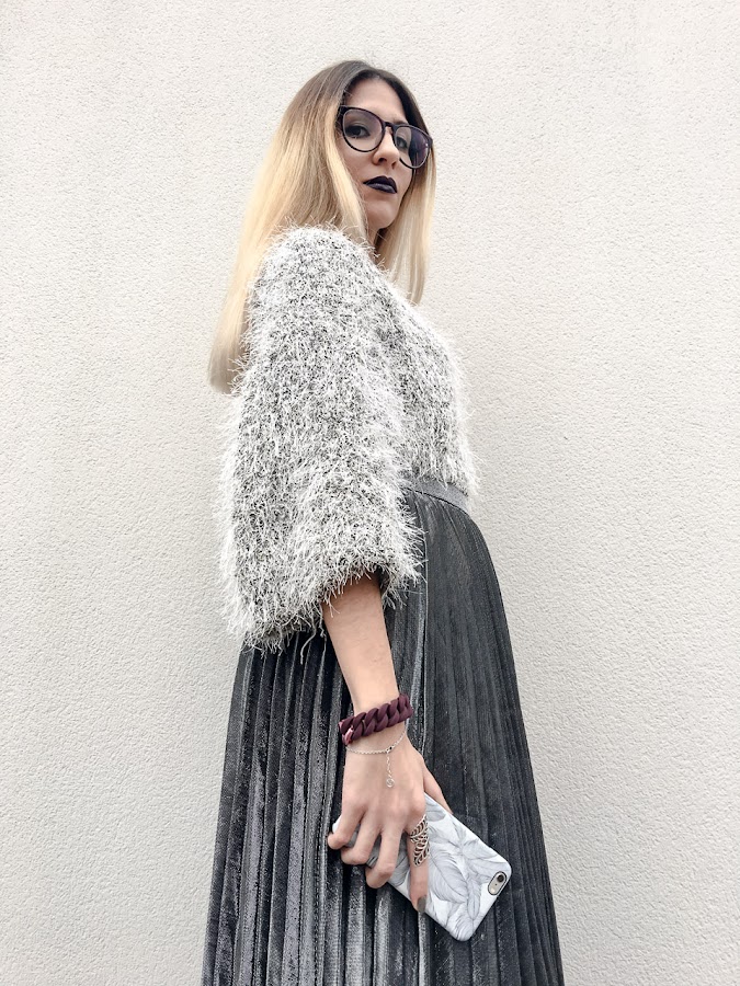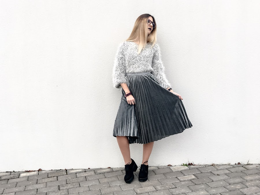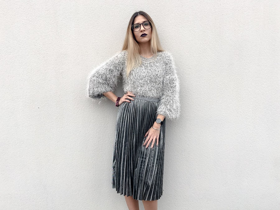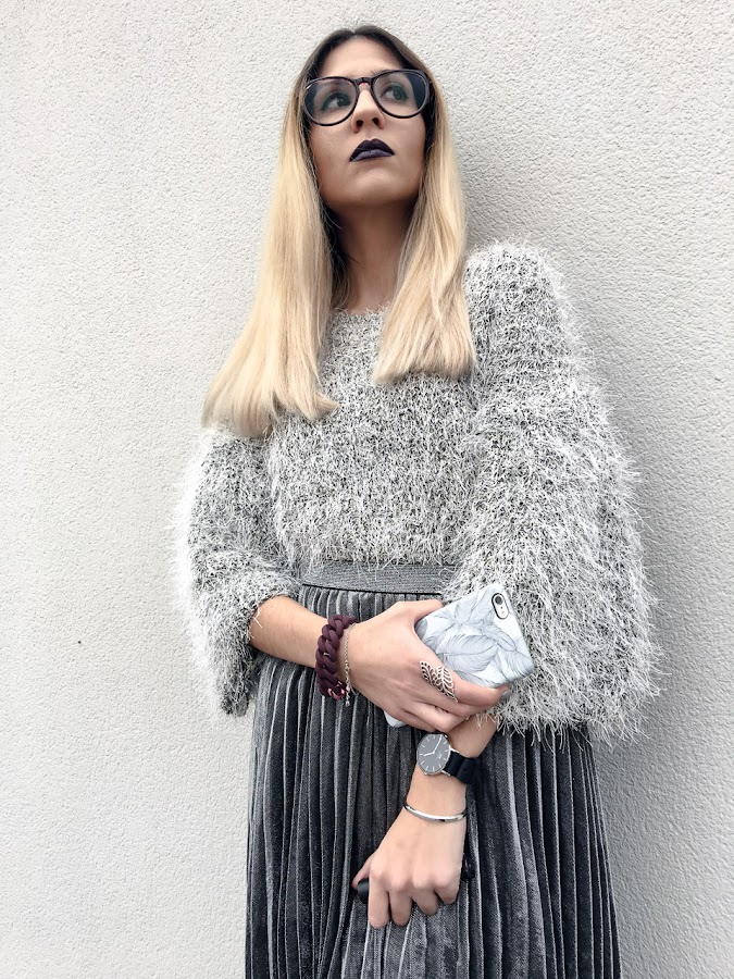 Y os traigo además, un nuevo look! Un total look de SHEIN que brilla por sí solo! Una falda midi plisada plateada y un jersey Crop de color gris y de pelito son los protas de hoy!Como complementos, he elegido mi pulsera de The Rubz, mi reloj ClassicBlack de Daniel Wellington y un color de labios muy especial, solo apto para atrevidas!