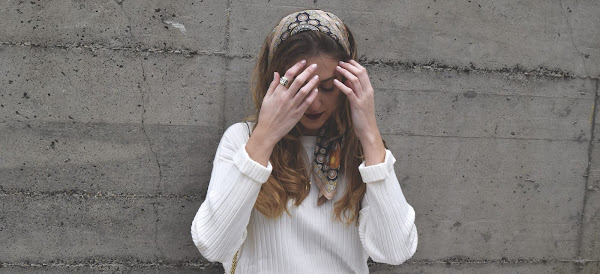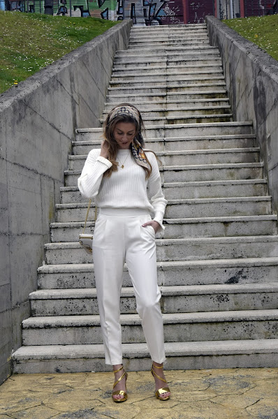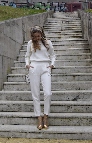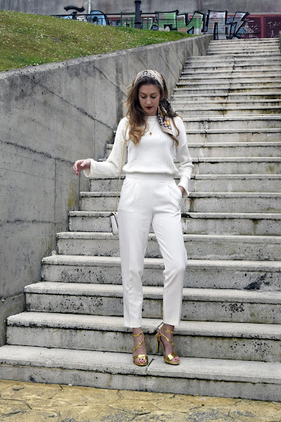 En este primer look le añadí un jersey blanco y como complemento, he elegido un pañuelo de diadema, que por cierto están muy de moda esta temporada y para mi tienen ese Je ne sais quoi que me recuerda a las divas de los años 50 . En cuanto a los demás complementos las sandalias doradas y bolso blanco de Michael Kors, que ya os he enseñado en anteriores post, le dan el toque de fiesta.
