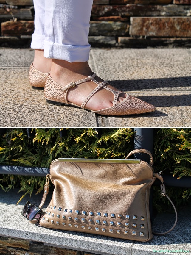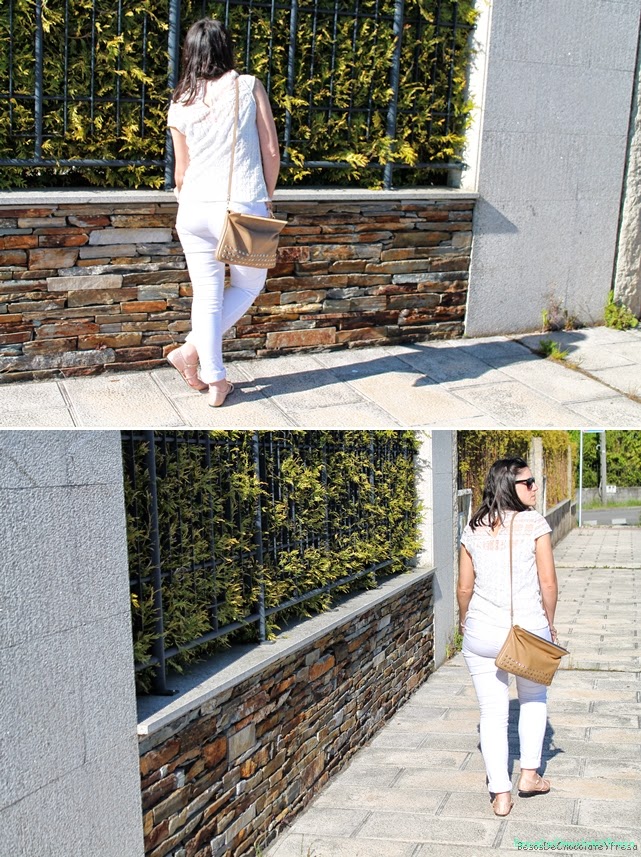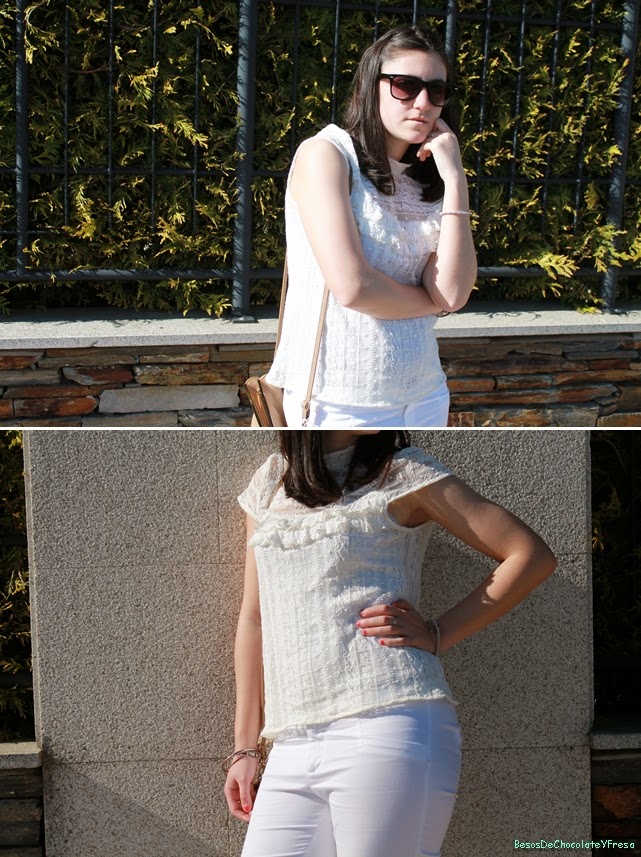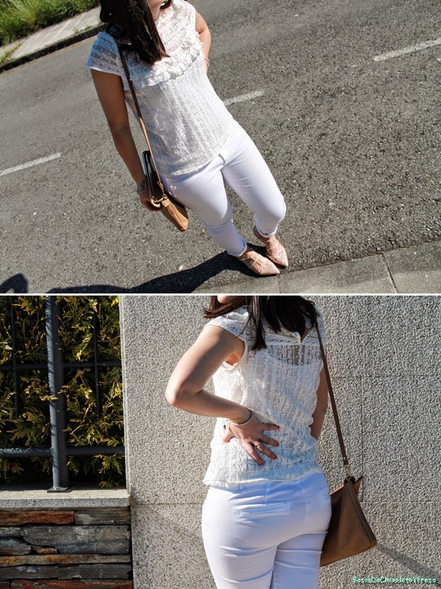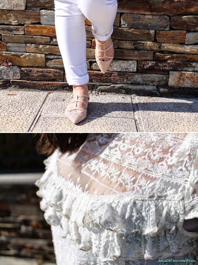 Para esta ocasión opté por jeans blancos, blusita de encaje transparente en blanco y complementos en nude como el bolso de tachuelas y las bailarinas de brillos, super cómodas y combinables.